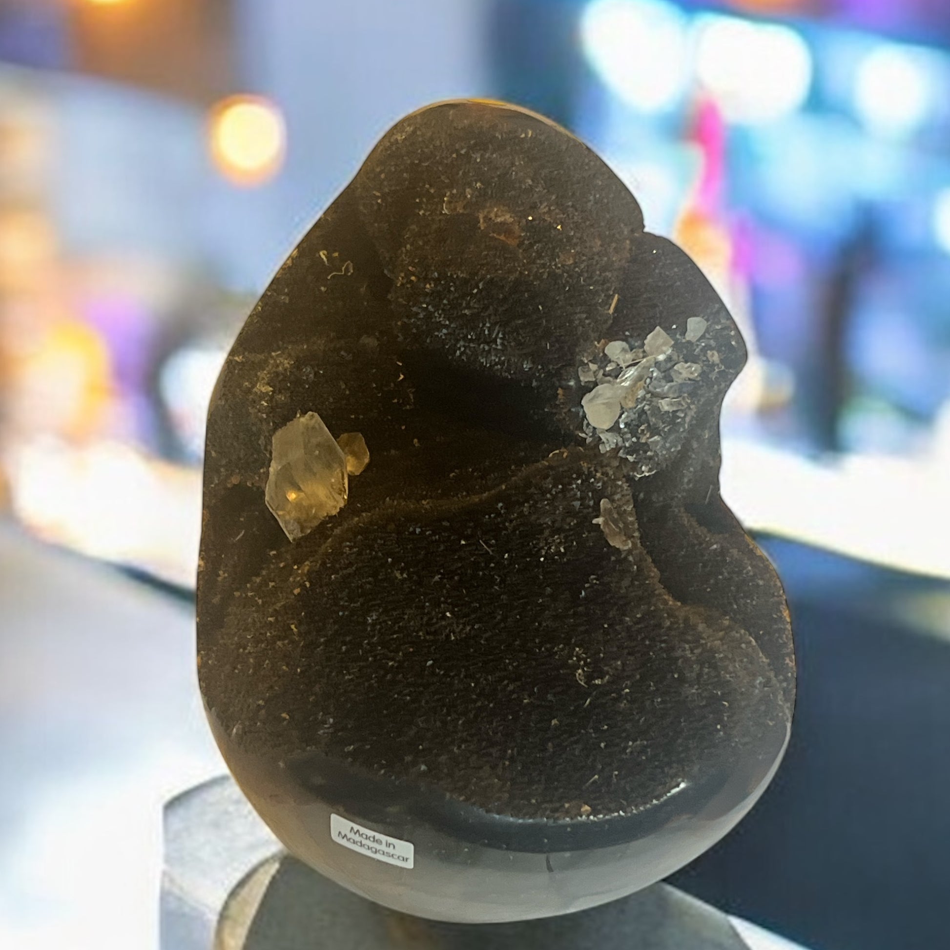Septarian nodules are geode-like formations that have been polished. The dragon-like "scales" are areas in which crystalline minerals have filled in vacant spaces more than 160 million years ago. No two are exactly alike. Septarian eggs are thought to help you relax and become more aware of your surroundings.