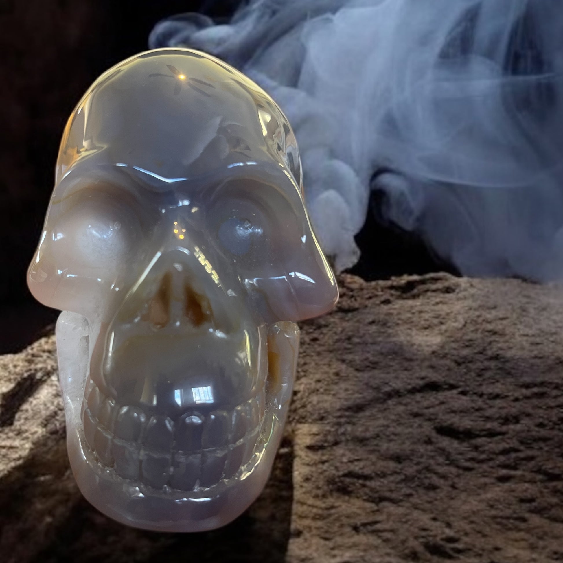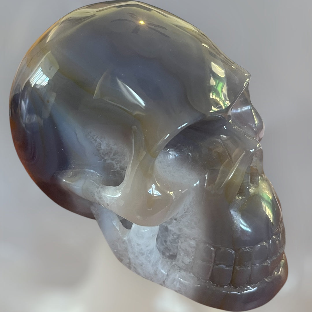 5-inch agate skull in soothing blues and whites carved by renowned Ying Shun Gems.
