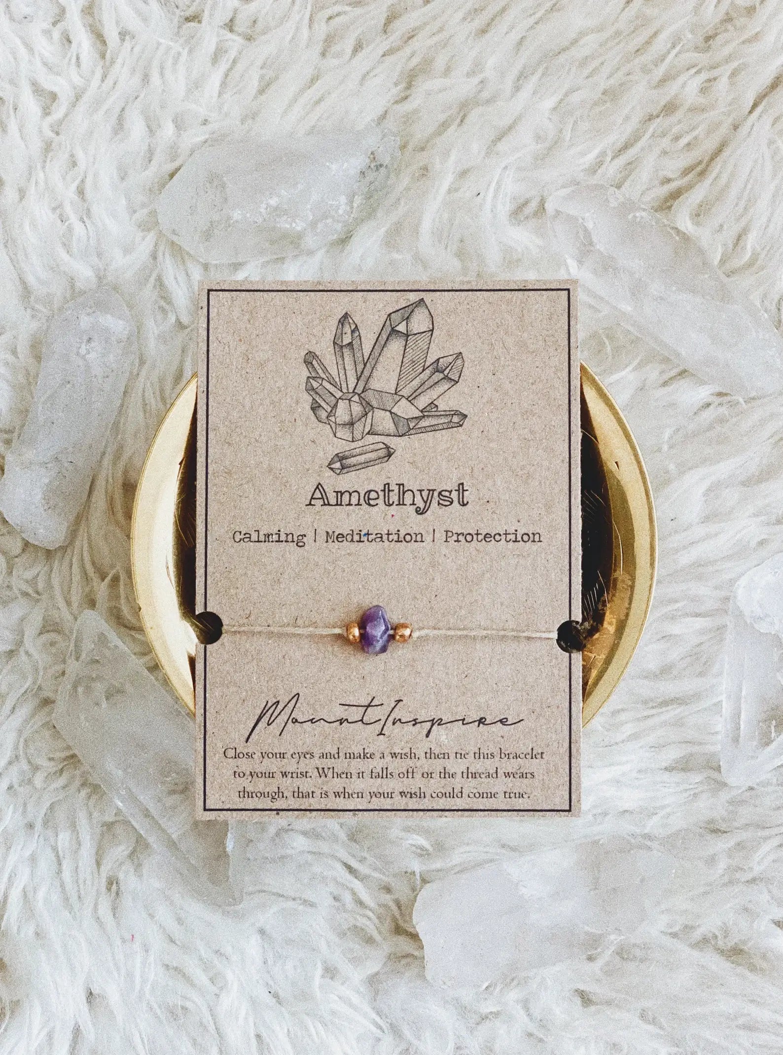 ~ Amethyst Crystal Bead ~ Tan Natural Hemp Cord ~ Eco-friendly Brown Kraft Paper Packaging ~ Two Small Gold Glass Beads ~ Easy Tie-on Bracelet Design ~ Simple and Elegant Style ~ Note: Hemp may have a natural earthy scent Experience the simple elegance of our Amethyst Crystal Wish Bracelet.