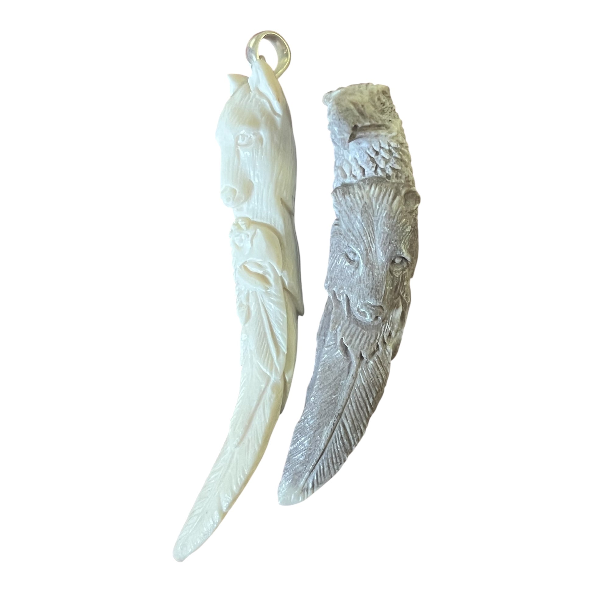 Hand-carved antler tip pendants featuring bear, buffalo, eagles, or wolves.