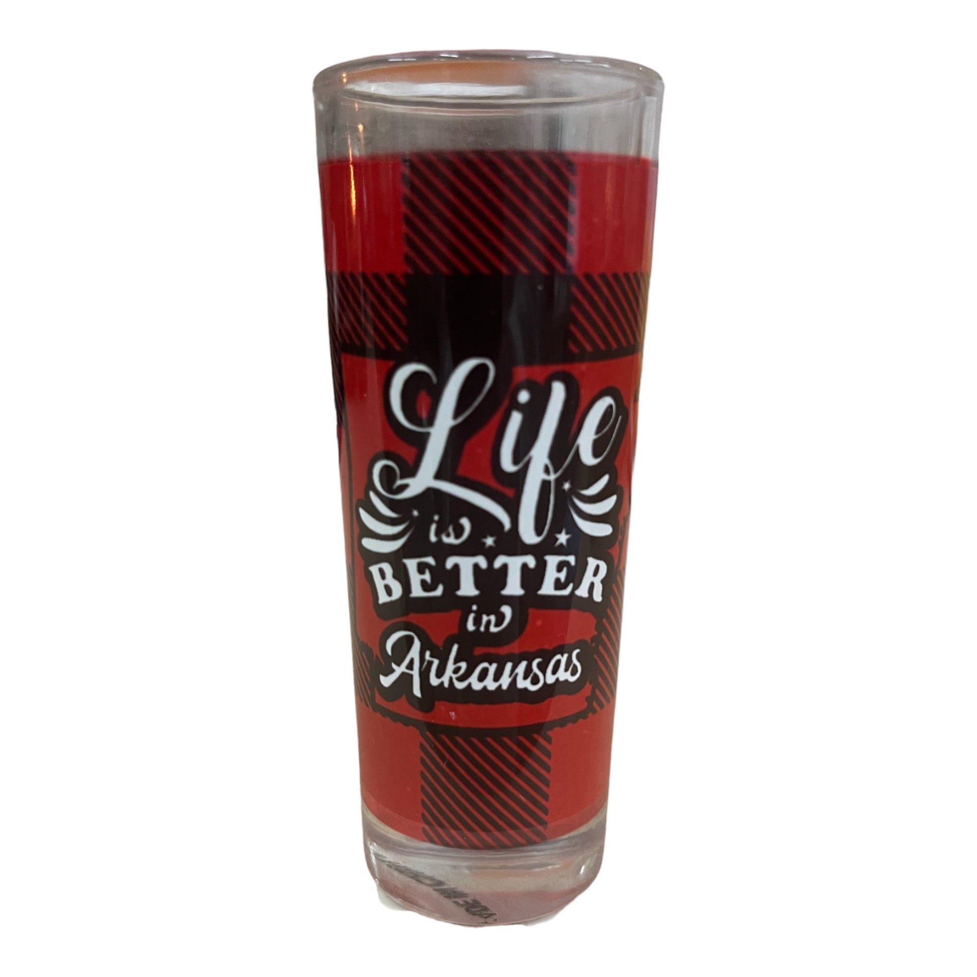 Ever-popular red and black buffalo plaid shooters remind you that Life is Better in Arkansas.