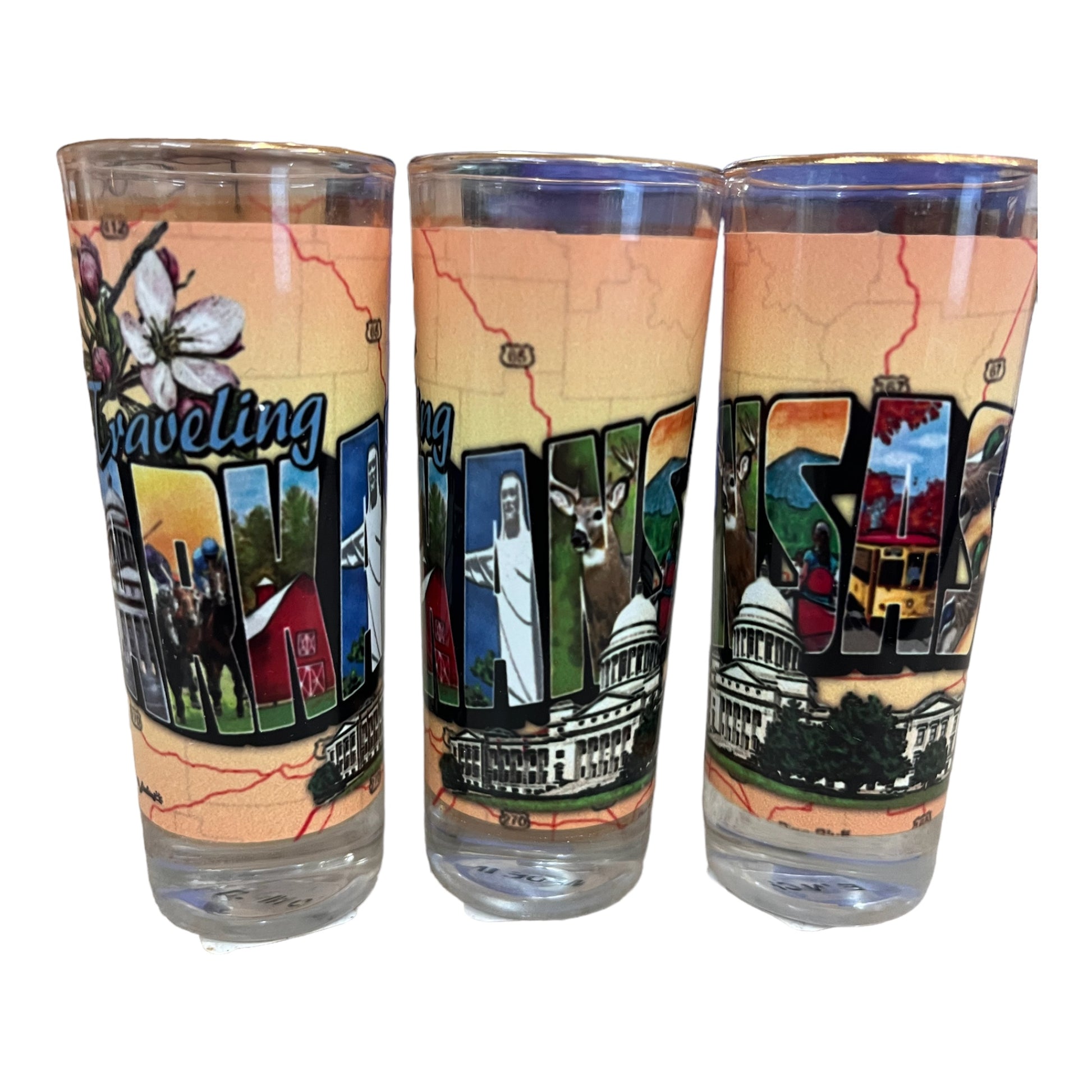 Images in each letter of the word Arkansas represent some of the state's most iconic attractions: including the state capital in Little Rock, Oaklawn race track in Hot Springs, the Christ of the Ozarks in Eureka Springs, and more.