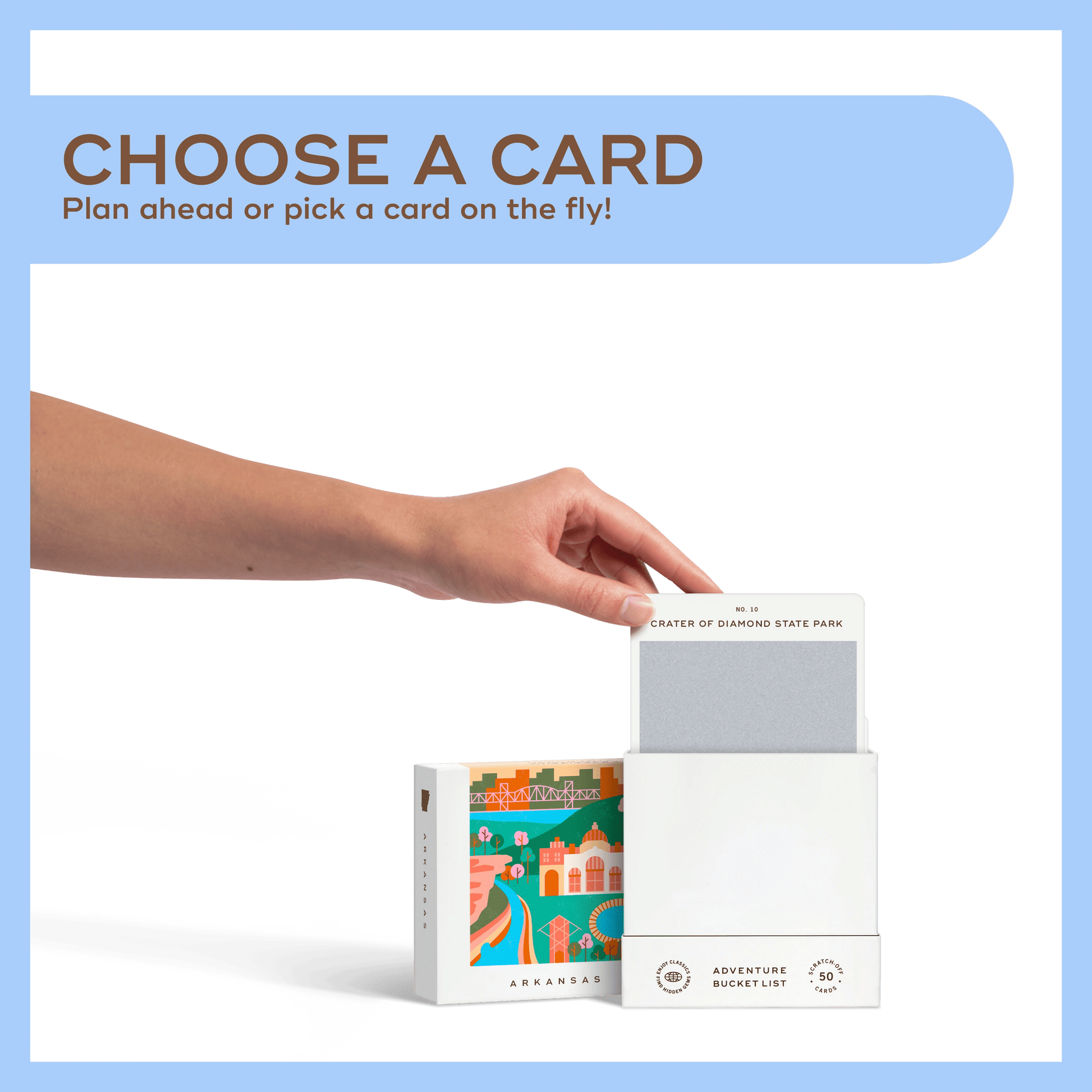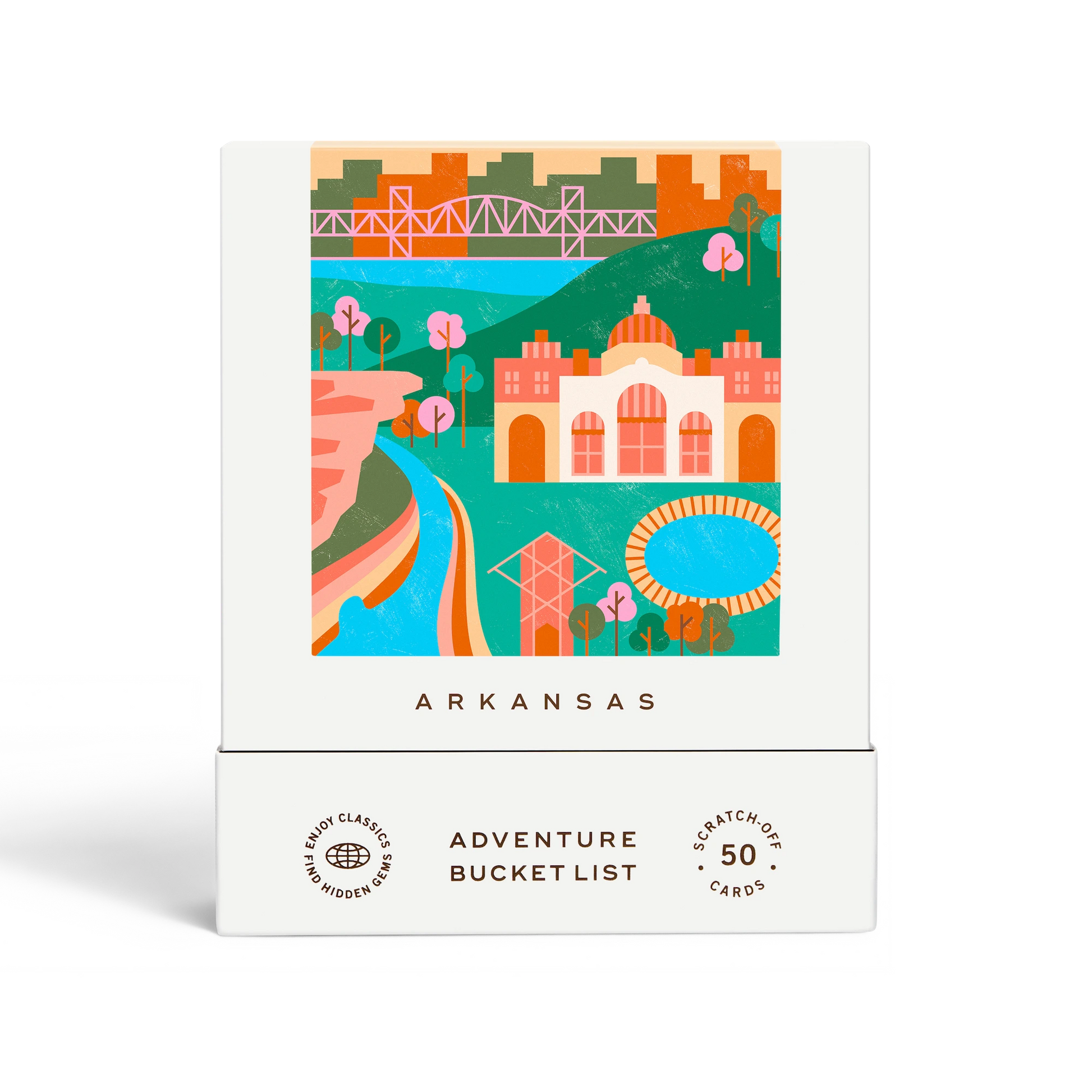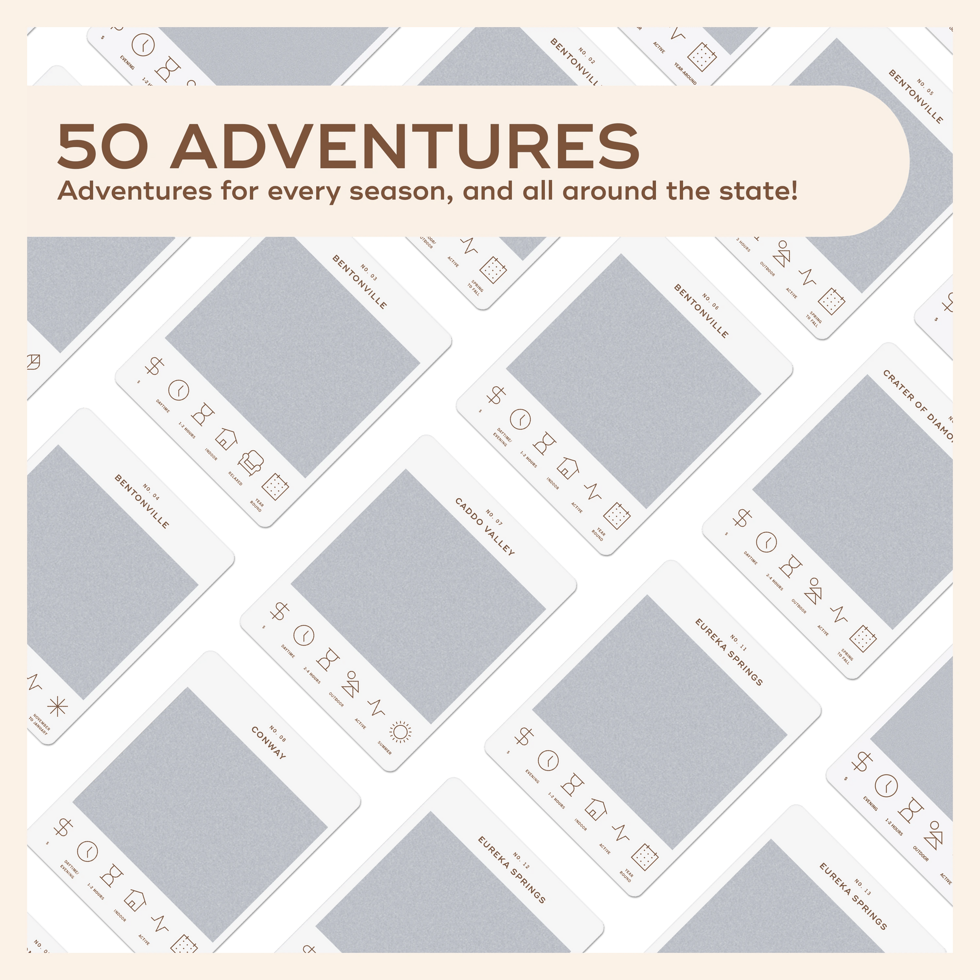50 scratch off bucket list adventures around the state of Arkansas. Pick a city that you want to explore, check out the icons at the bottom of the card to determine the season, cost, and time of day, and then scratch off the card to reveal your adventure!