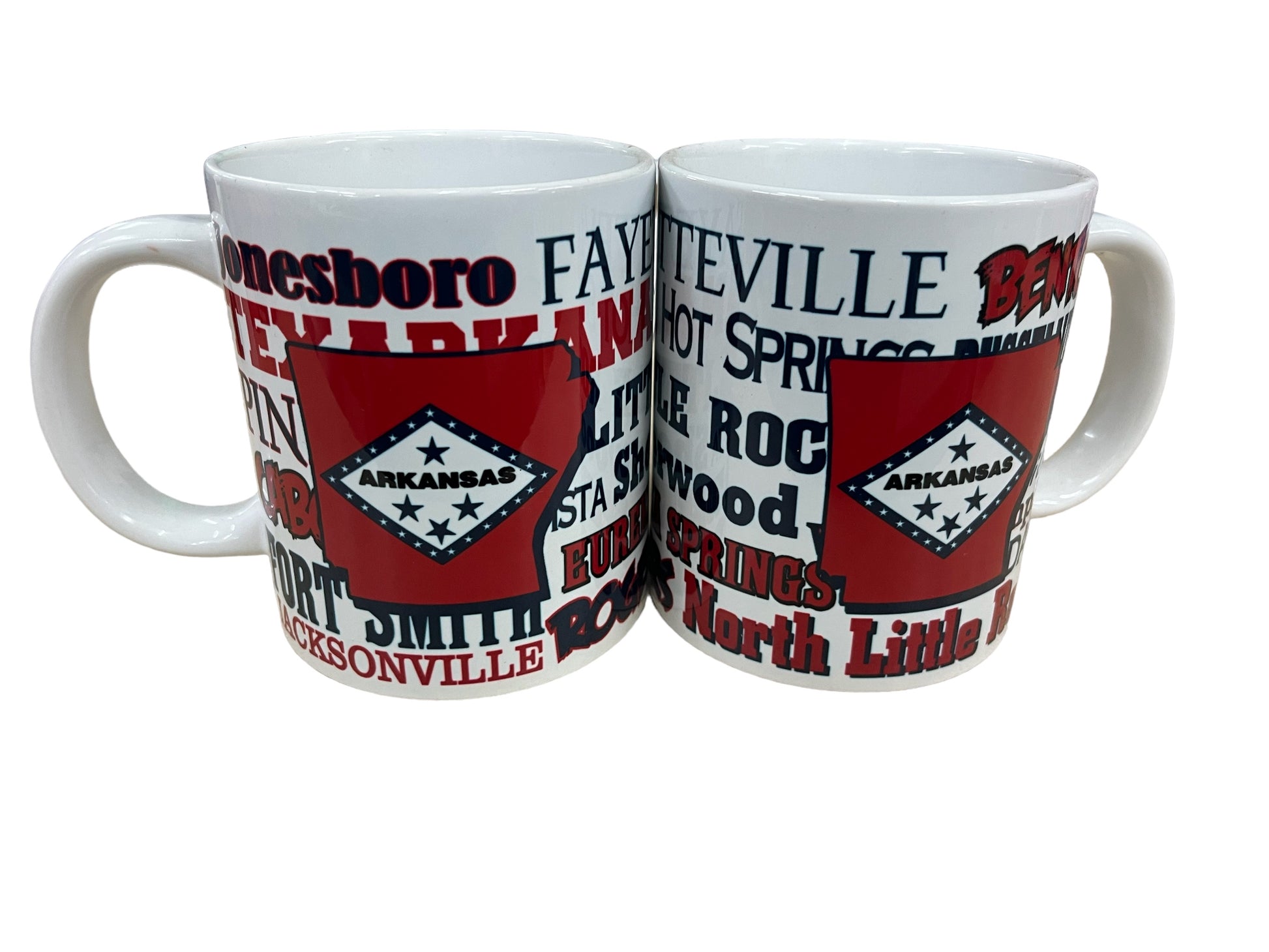 Huge coffee mug large enough to hold ALL the coffee from ALL the places in Arkansas. Lists the names of the major cities in Arkansas, and includes an outline of the shape of the state, in addition to the flag design.
