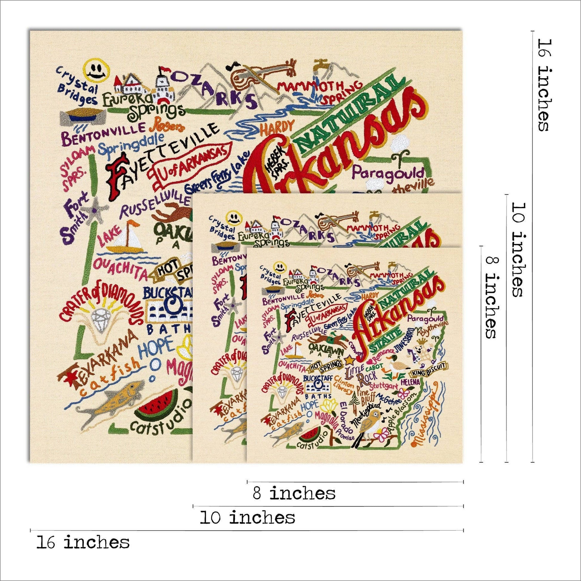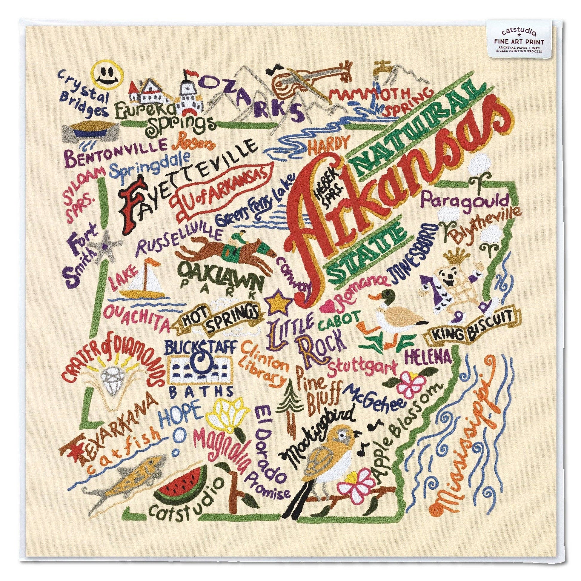 This Arkansas artwork is hand-embroidered, scanned using state-of-the-art equipment, and then artfully printed in the USA on crisp, museum-quality paper - perfect for framing! What makes them extraordinary: each art print is prepared by hand and signed by our printing staff on the insert card. Bonus: includes a free sticker gift!
