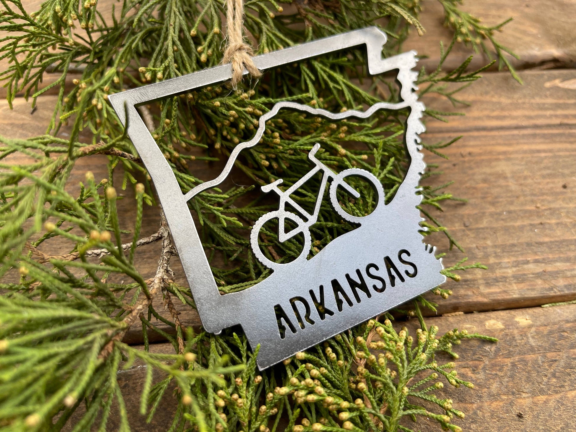 Arkansas State Mountain Bike Ornament made from Raw Steel