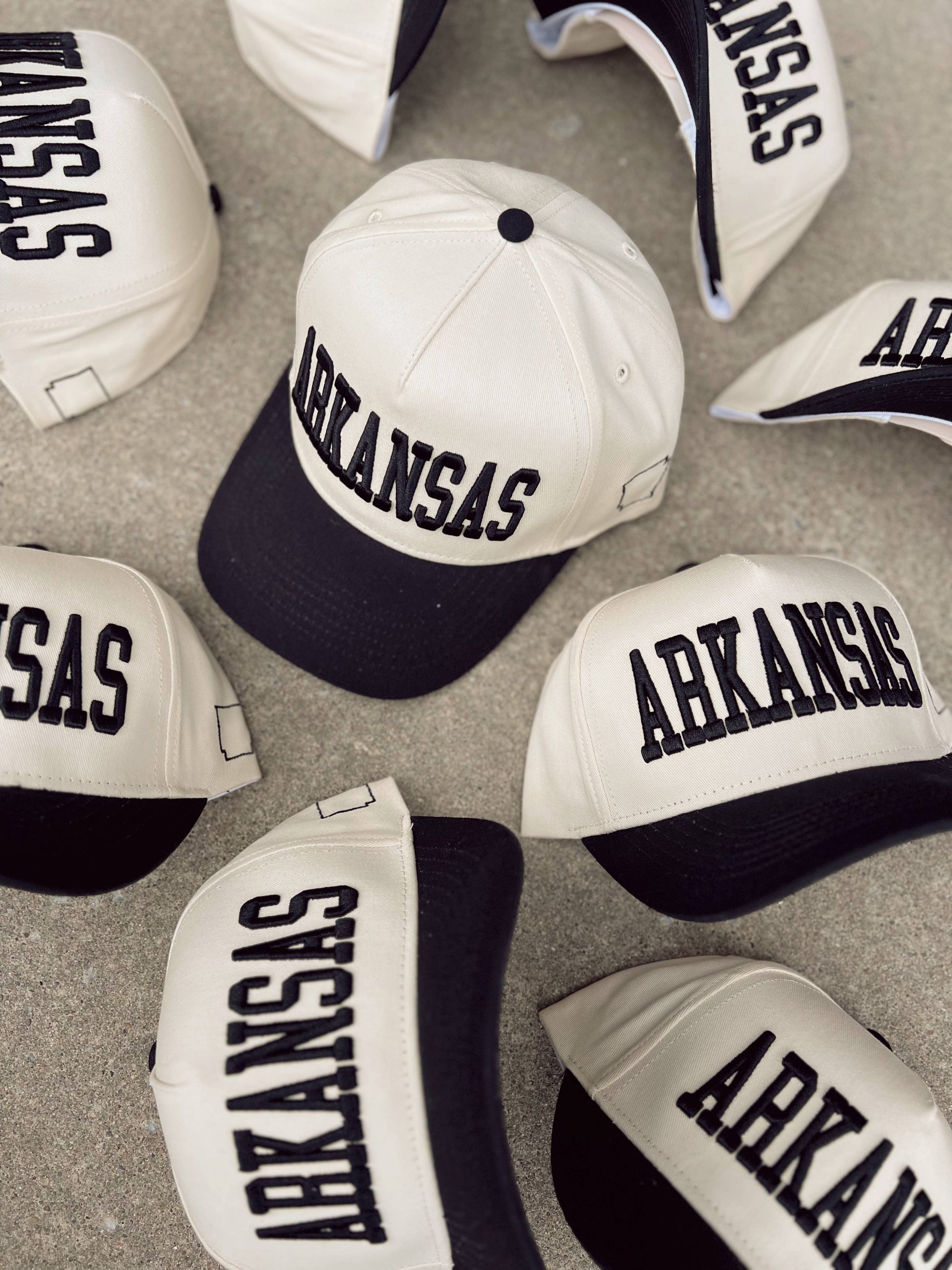 Black and linen colored snapback cap with Arkansas embroidered in black and with the state of Arkansas outlined on the side. Made by a woman-owned company out of Fayetteville, Arkansas.