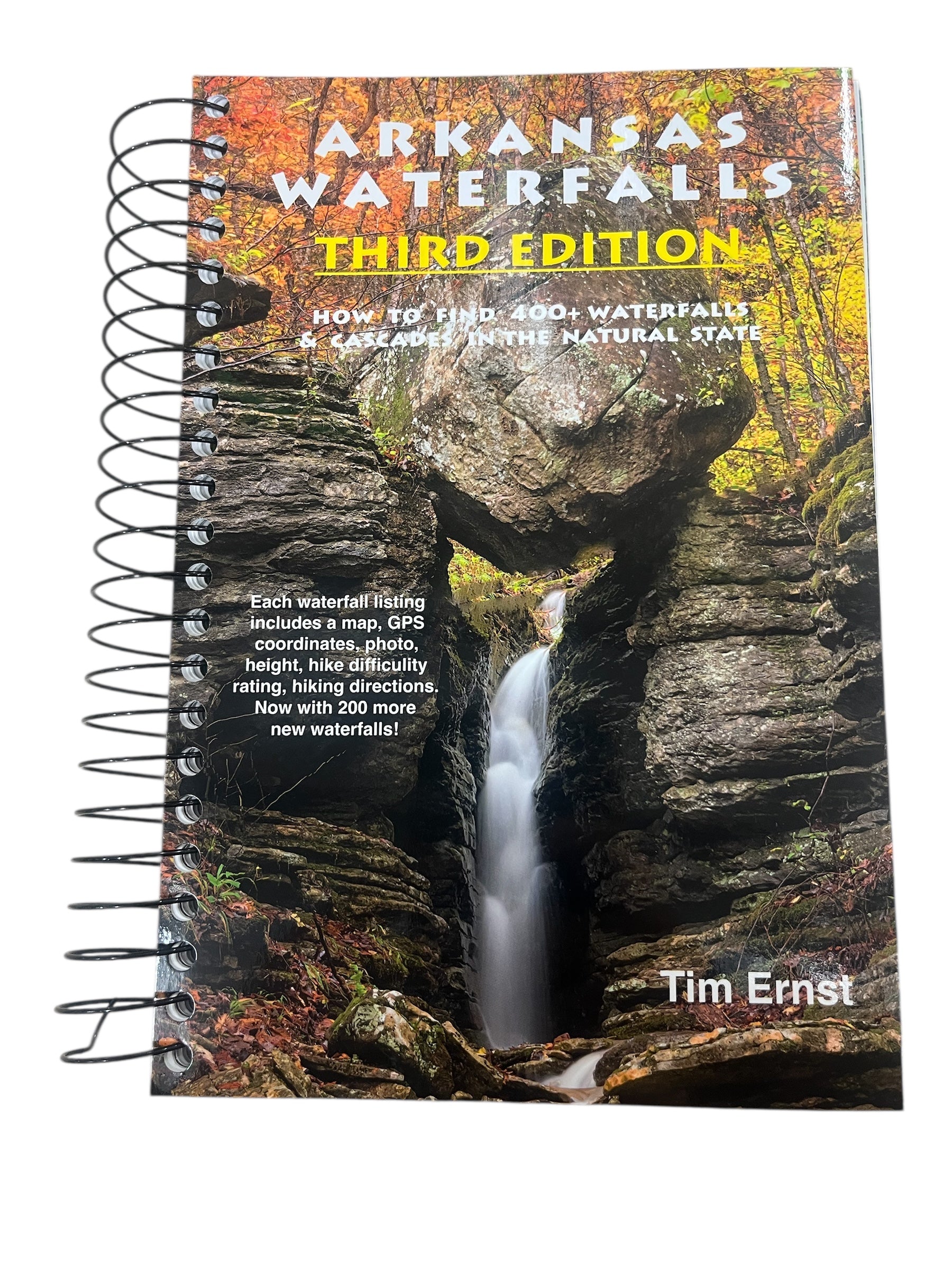 First published 2011, updated in 2014, and the Third Edition has just arrived at the end of 2025 with a convenient spiral binding and 200 new waterfalls, this guidebook from Tim Ernst features all the info you need to find more than 200 spectacular waterfalls and cascades in “The Natural State.” Each waterfall listing contains a map, COLOR photo of the falls, GPS coordinates, height measurement, hike difficulty rating, plus detailed descriptions of how to get to the trailhead and to the waterfall itself. Some of the waterfalls can be seen from your car, others can be reached by a short hike on an established trail, still others require a difficult bushwhack hike through the wilderness to reach – all of this detailed and rated in the guidebook.