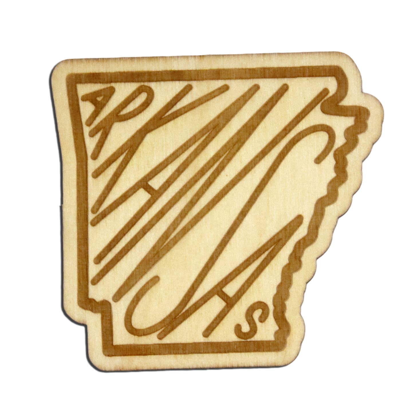 This magnet is cut in the shape of Arkansas and features an engraved outline of the state as well as the name of the state in a hand lettered font. Each Arkansas magnet is cut from 1/8” birch wood, has a contour cut magnet on the back side and measures 2.75” x 2.6”.