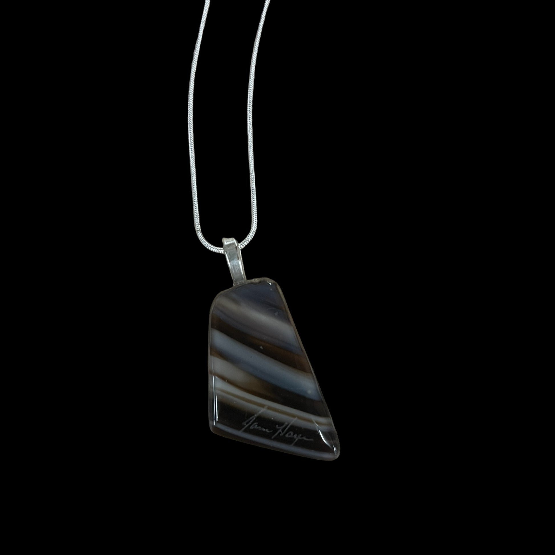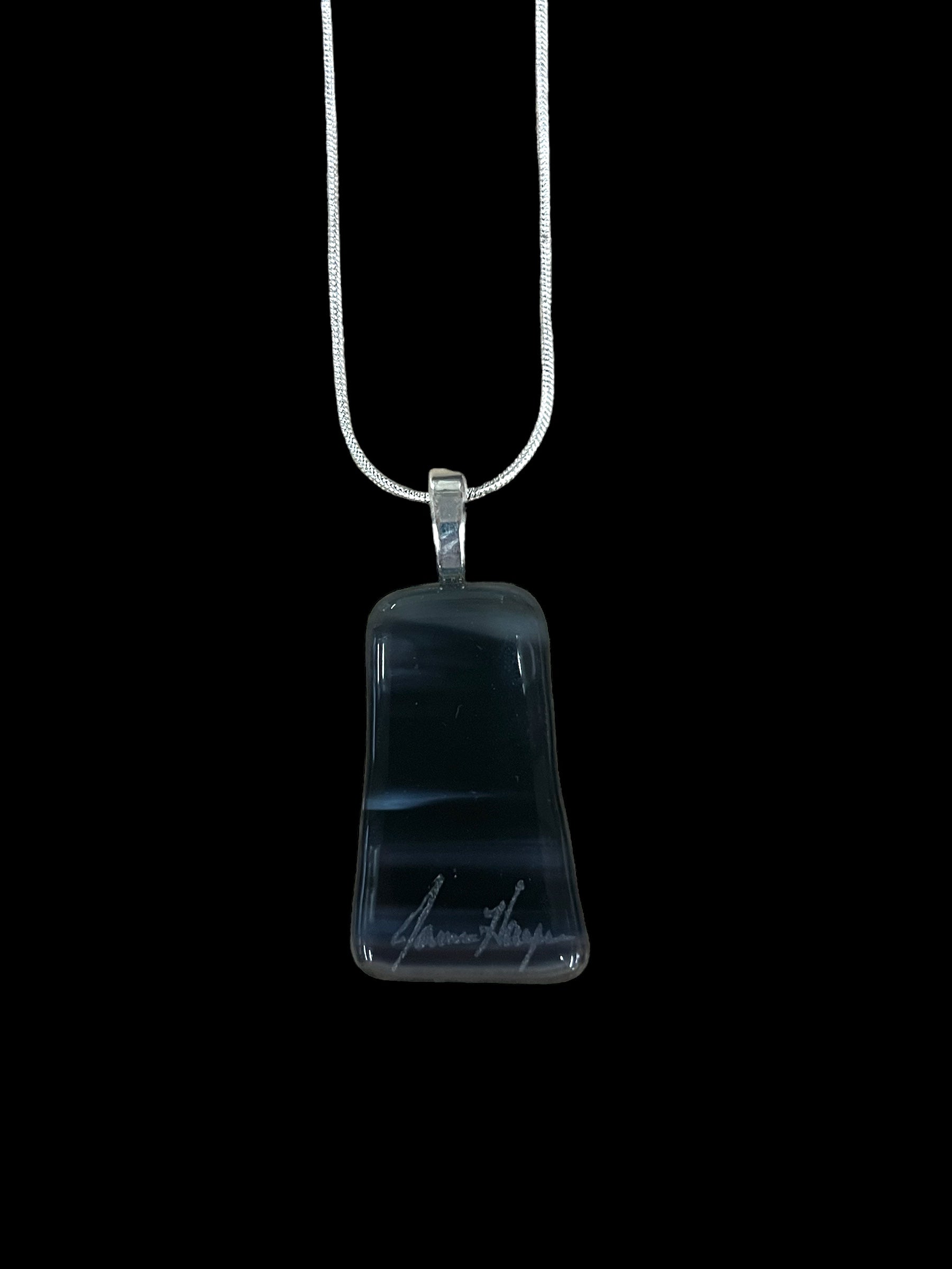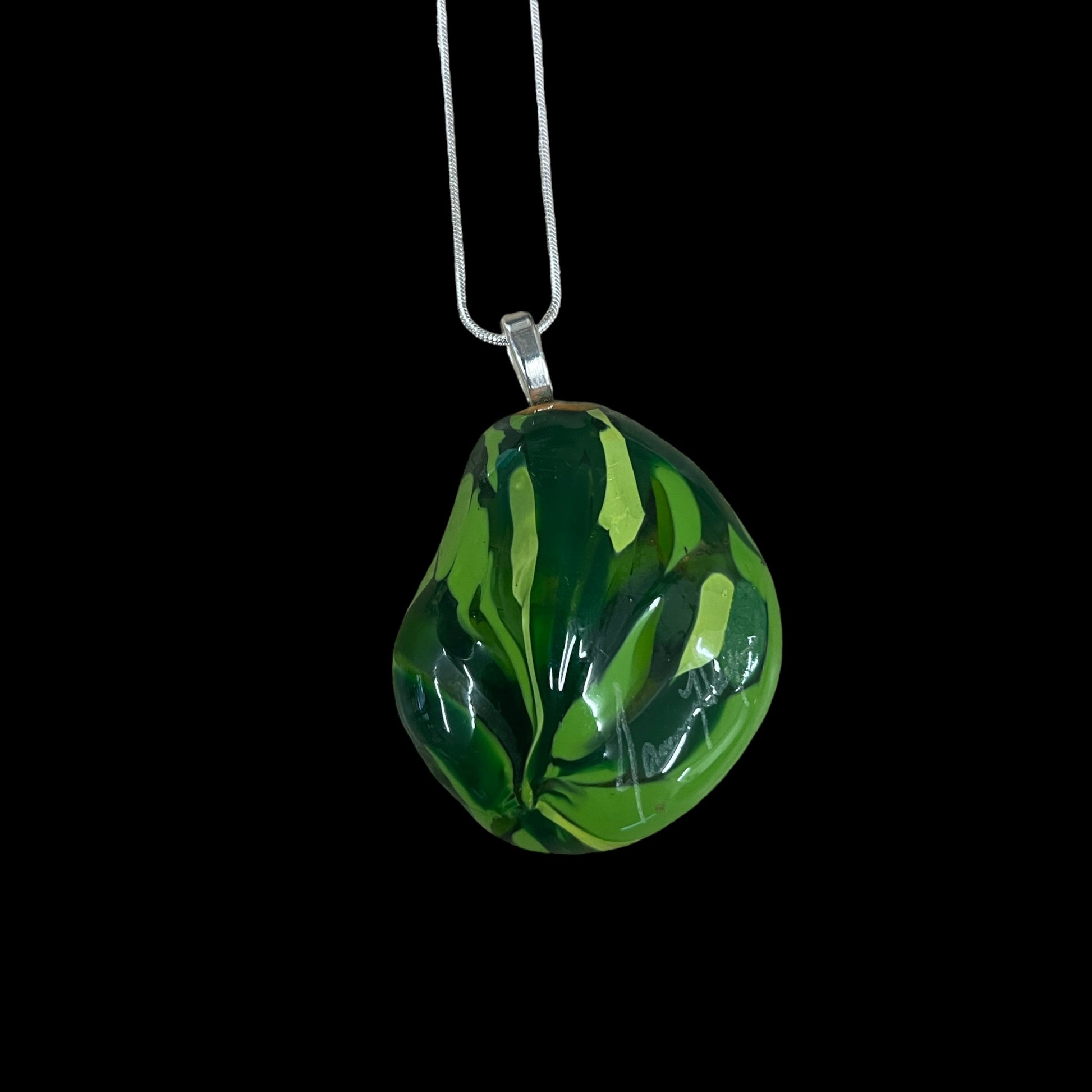 No two James Hayes' pendants are ever exactly alike! Handcrafted and signed from his fine art glass made in Arkansas, these pendants are the epitome of fine fashion without the expense. Comes with a silver 20 inch serpentine chain.