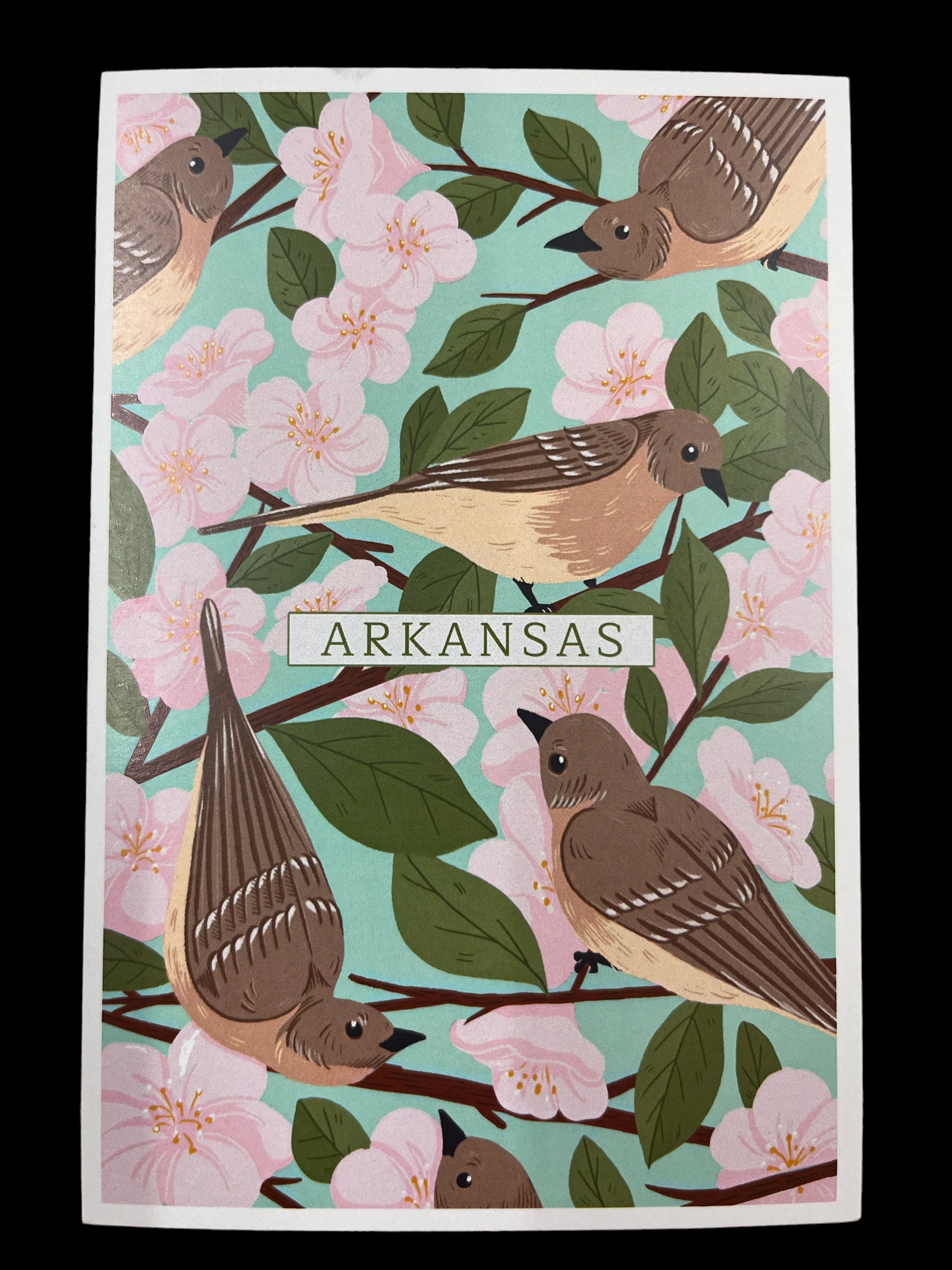 Apple Blossom: Celebrate Arkansas' state bird -- the mockingbird -- and its state flower -- the apple blossom -- in this lovely pastel postcard.