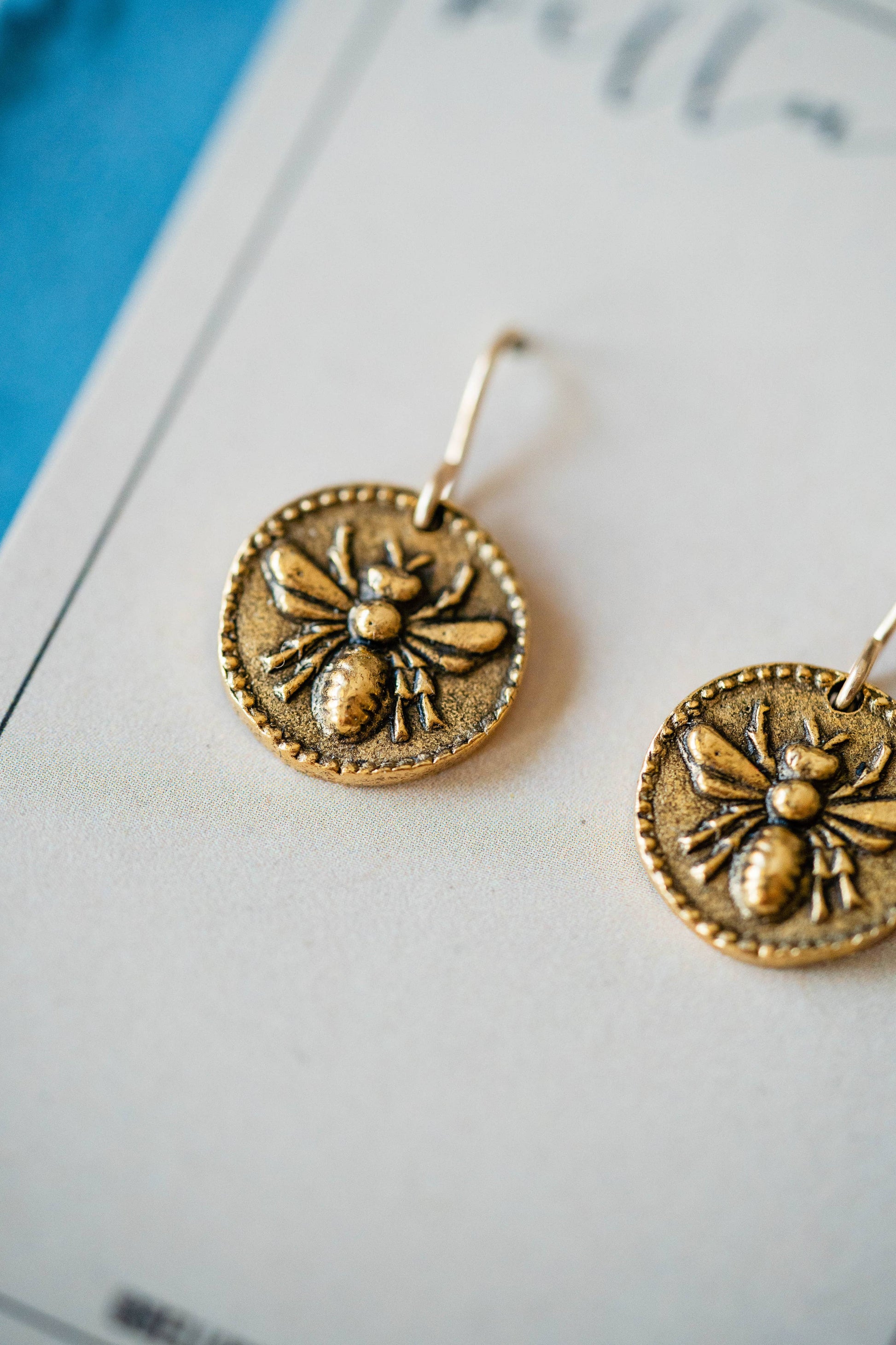 Charms in this collection are made from molds of antique buttons and added to ear wires. - Bee Charm in gold plated pewter - Heirloom Bitty Button Charms are approximately 1/2” dia - gold plated charm on 14k gold filled french hook - Handcrafted at the Bella Vita Studio in Downtown Little Rock, Arkansas