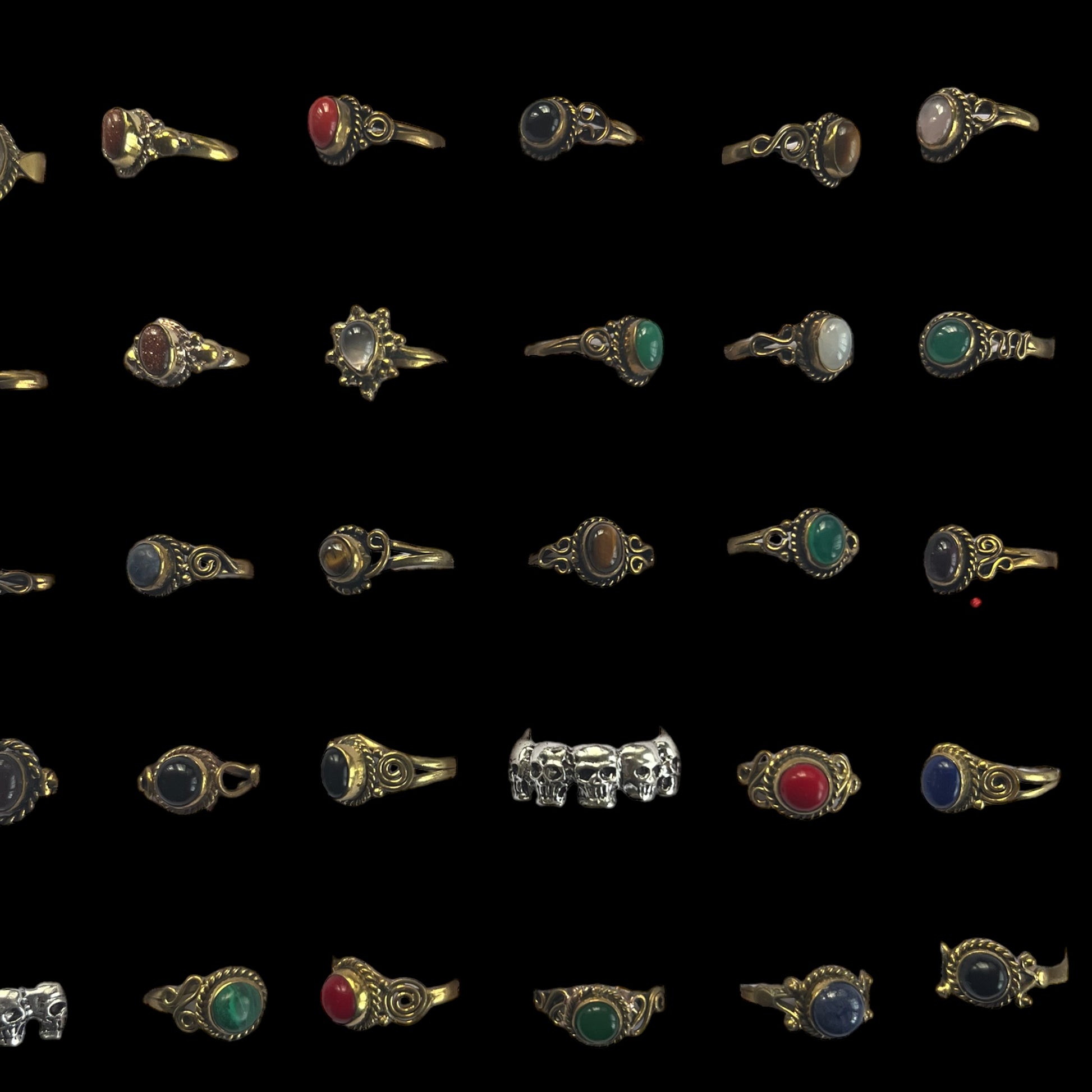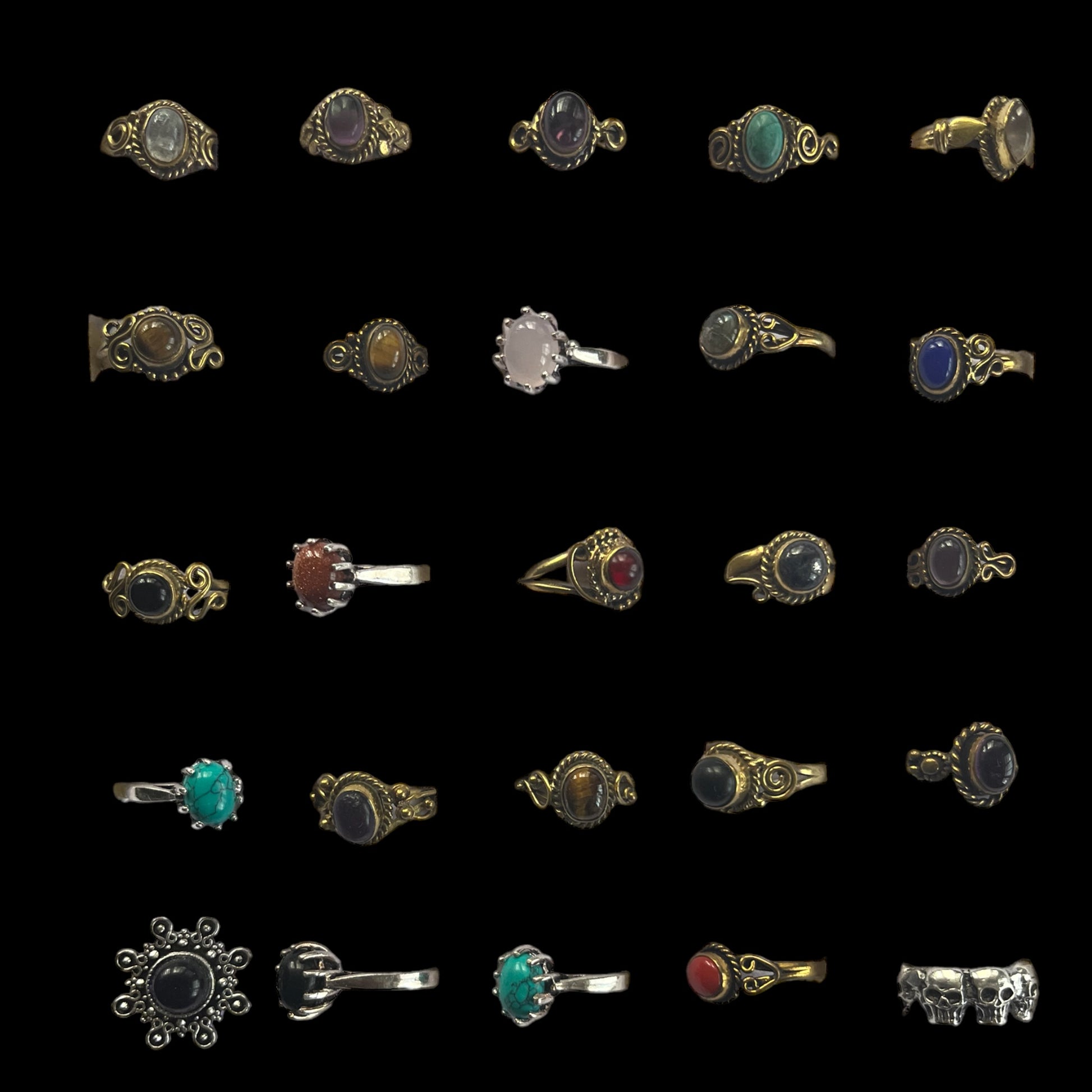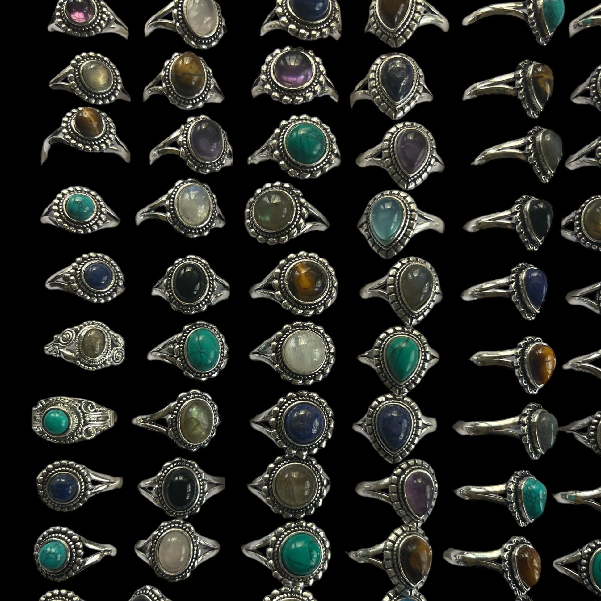 Natural stones set in brass rings with a silver overlay, enabling you to have an array of rings in all colors and styles at a fraction of the usual cost!