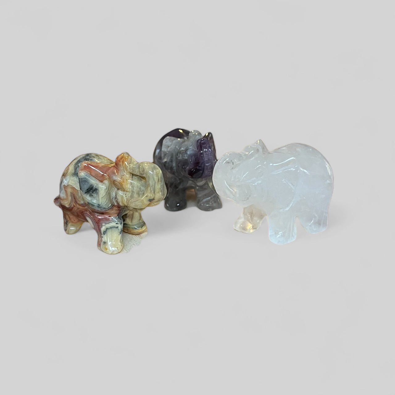 Carved from stone by master artisans, these elephants come in amethyst, tiger eye, opalite, obsidian, and more!