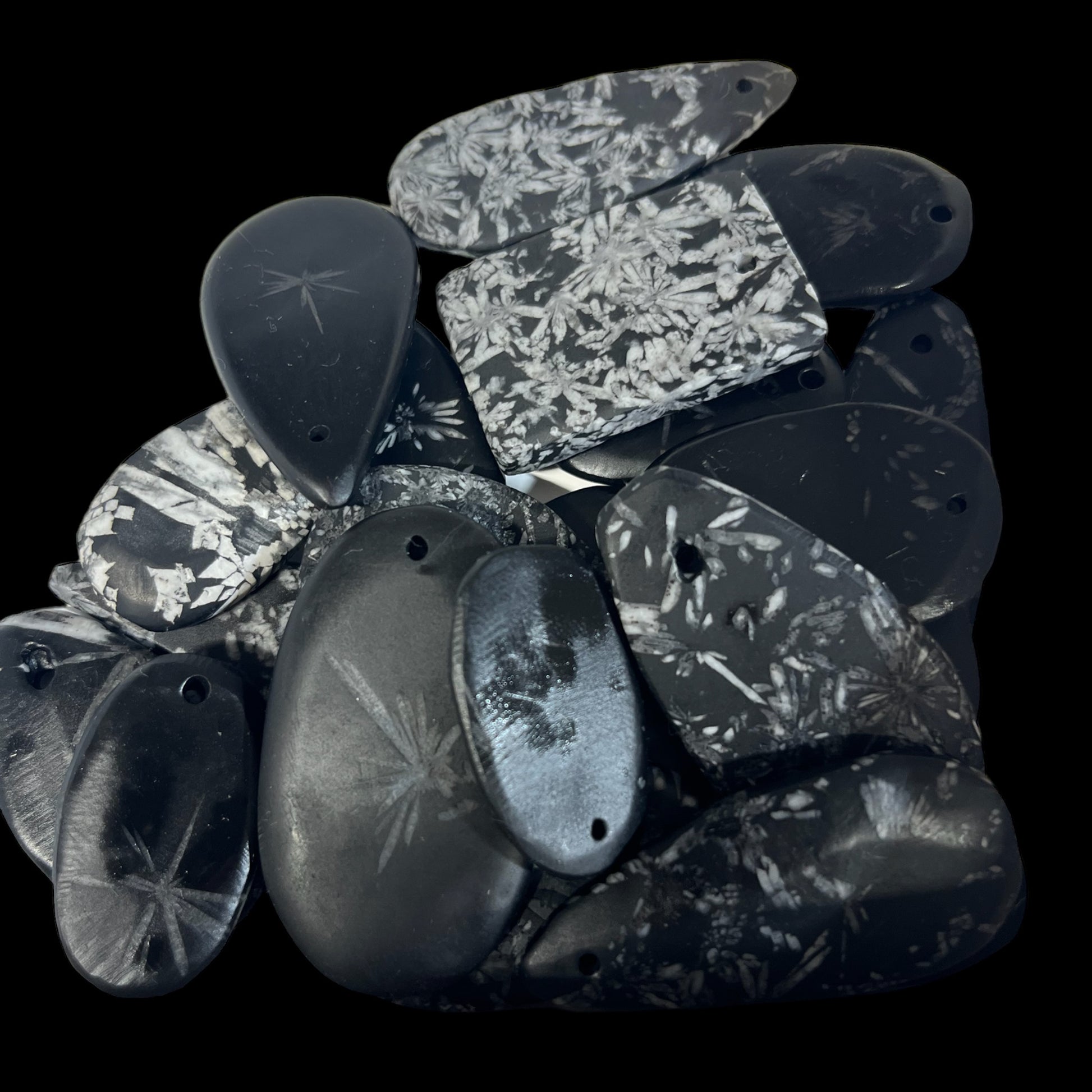 Chrysanthemum Stone, also known as flower stone, has a black matrix and natural white inclusions of calcite, feldspar, crandallite, andalusite, and celestite. The inclusions resemble a chrysanthemum flower. The rare stone primarily comes from China and is believed to assist with abundance, joy, and maturity.