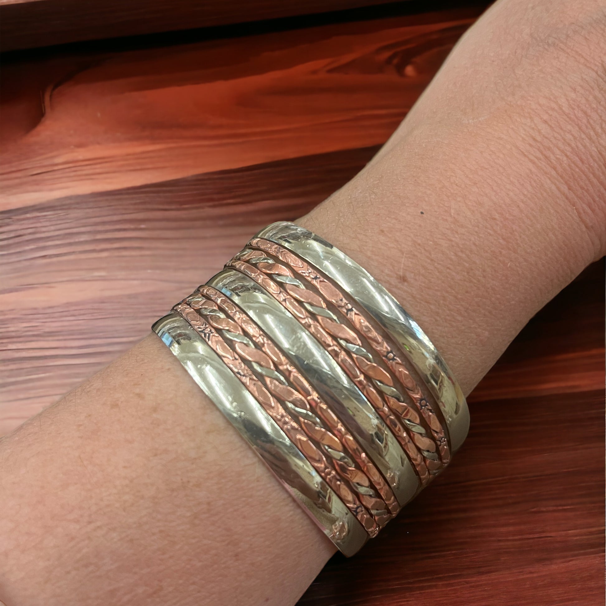 Wearing copper has long been touted as an easy and fashionable way to treat arthritis. In addition, the energy of copper is said to promote emotional well-being, enhance creativity, and increase self-confidence. These copper bangles can be adjusted to different sized wrists and look great on all genders.