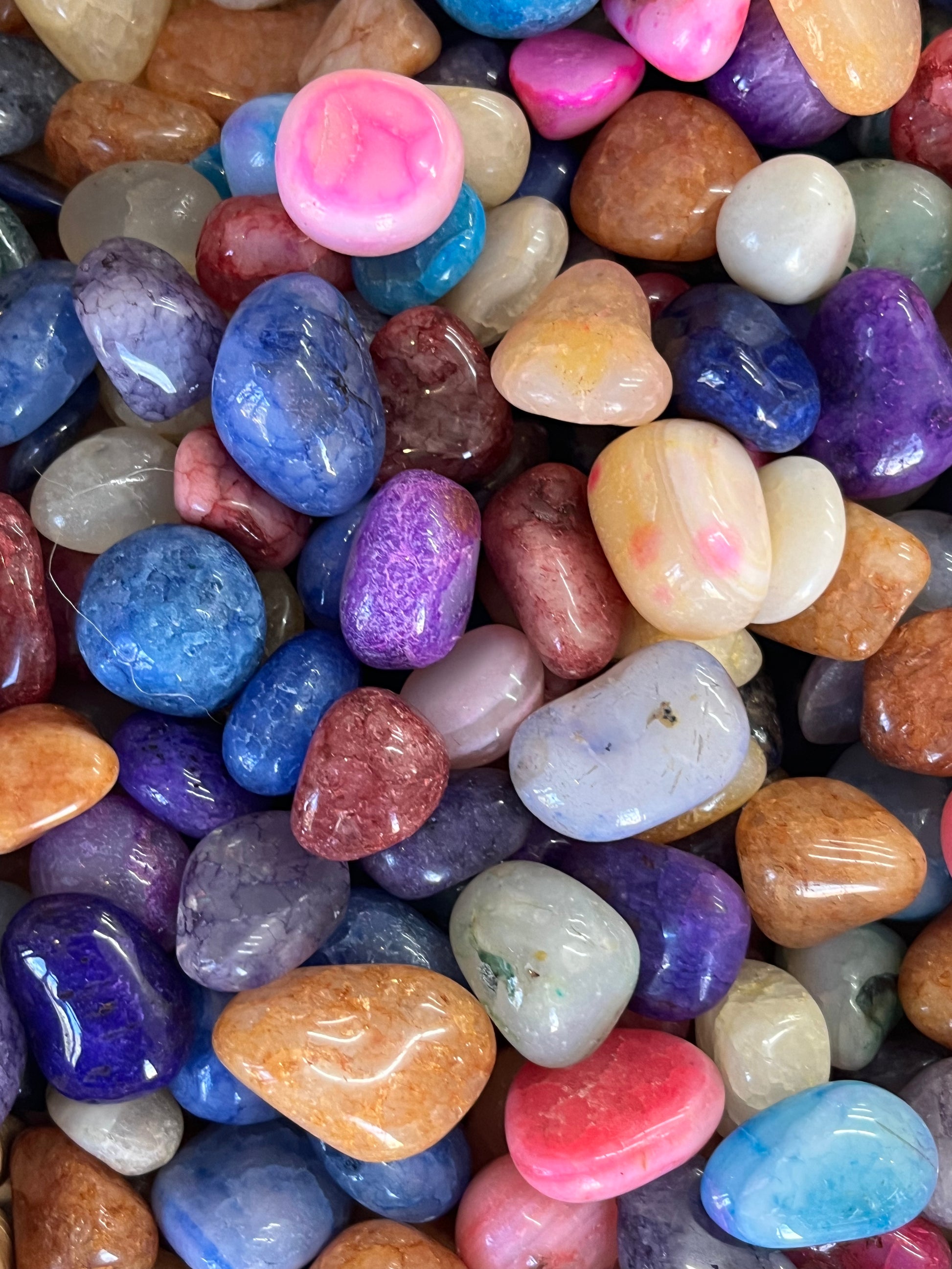 Chalcedony, which is a quartz variety, can bring about balance, goodwill, and inner peace. These pieces have been dyed.