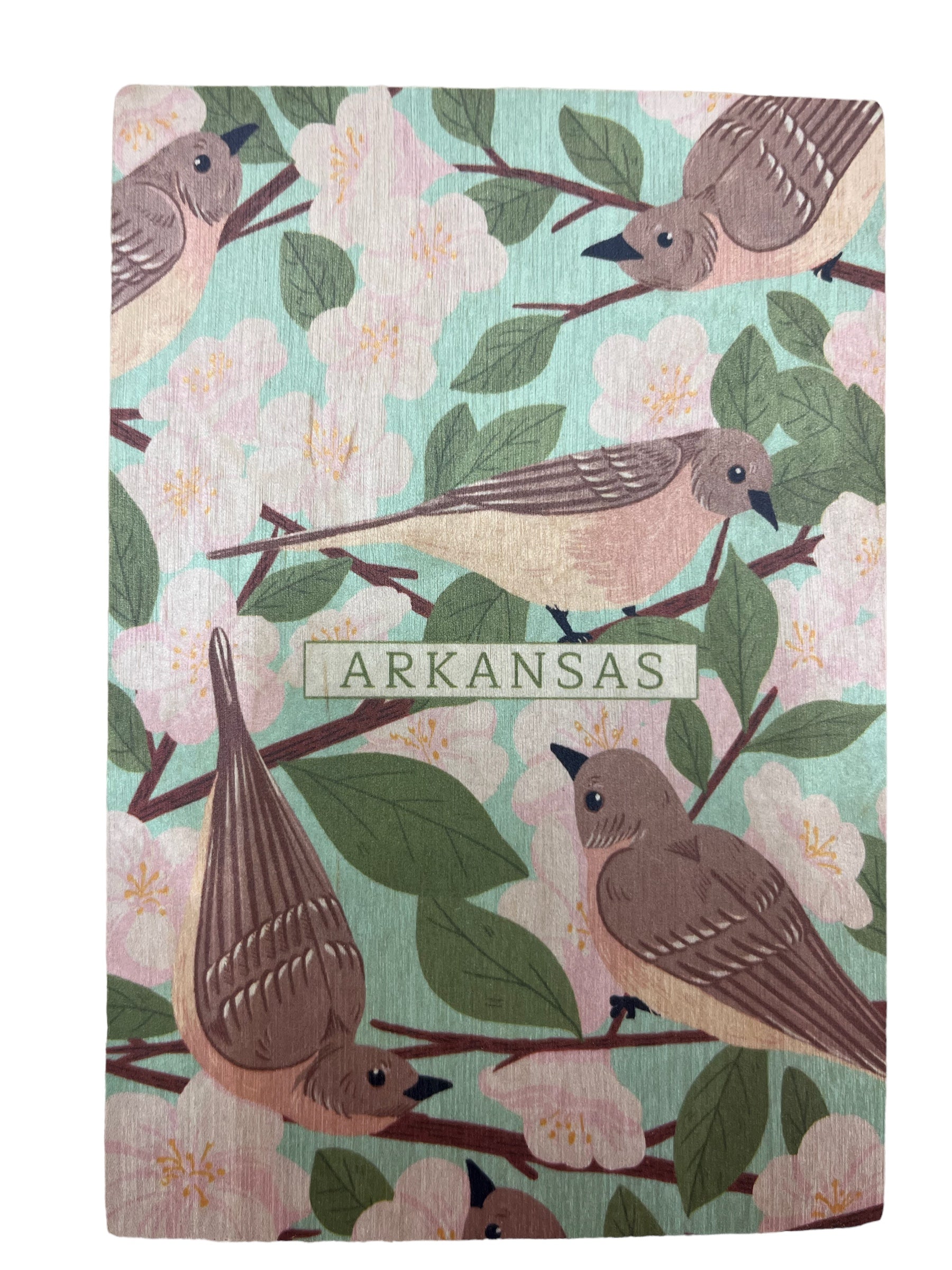 Apple Blossom: Celebrate Arkansas' state bird -- the mockingbird -- and its state flower -- the apple blossom -- in this lovely pastel postcard.