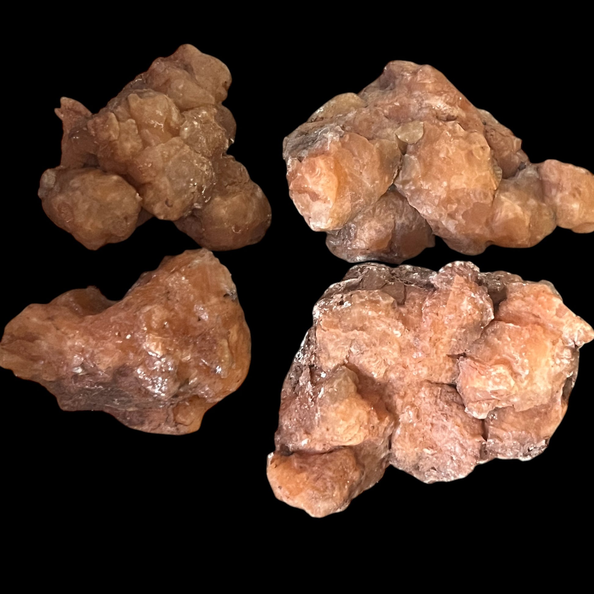Orange selenite is a member of the gypsum family. This variety crystallizes in the form of masses, and the color is from impurities of hematite within -- the darker orange pieces contain higher amounts of hematite than the lighter colored pieces.