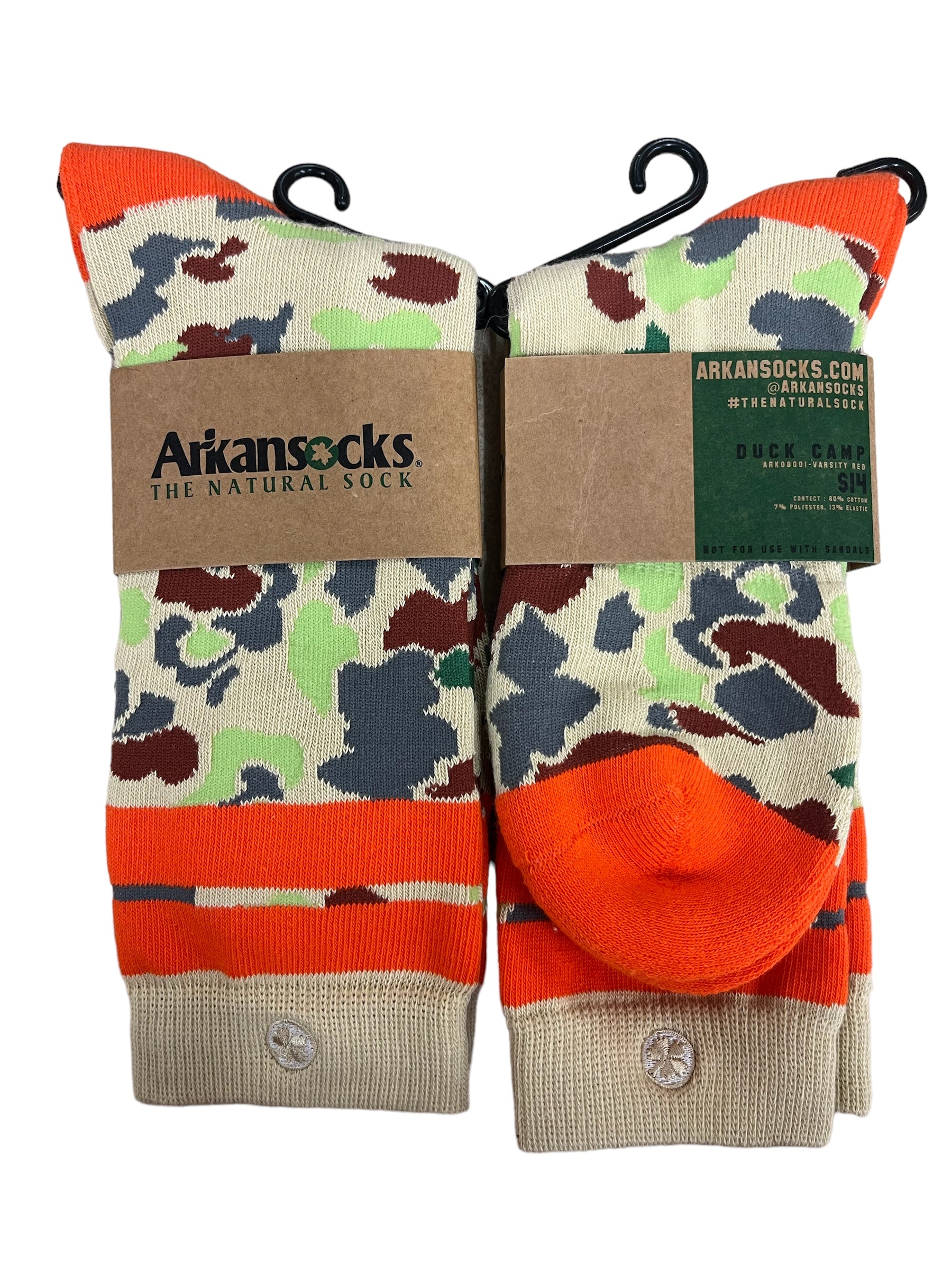 Designed right here in Arkansas, these Arkansocks make each trip to the Duck Camp more special. The camouflage pattern keeps you hidden from the ducks, while the bright orange stripes ensures your fellow hunters know you are there.