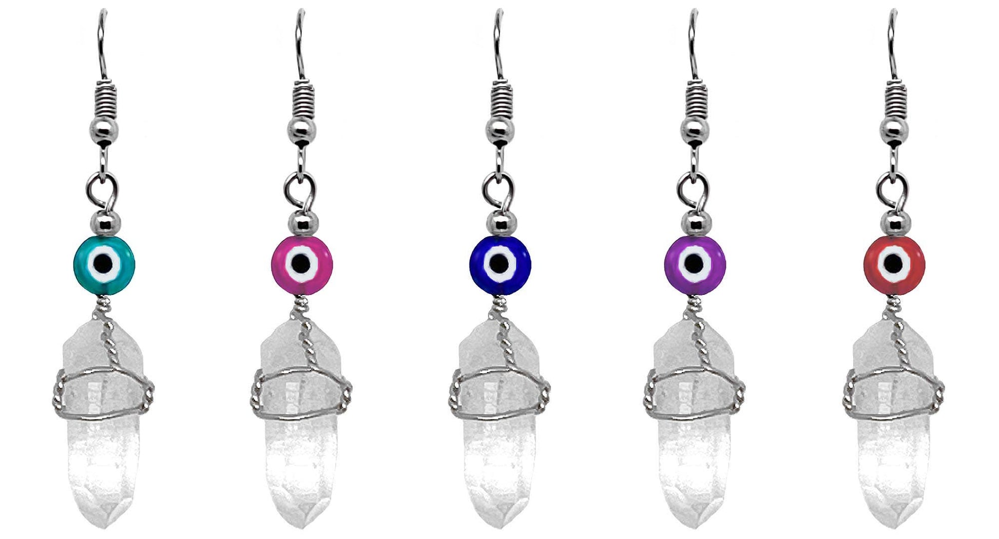 Evil Eye Bead Wire Wrapped Quartz Crystal Dangle Earrings