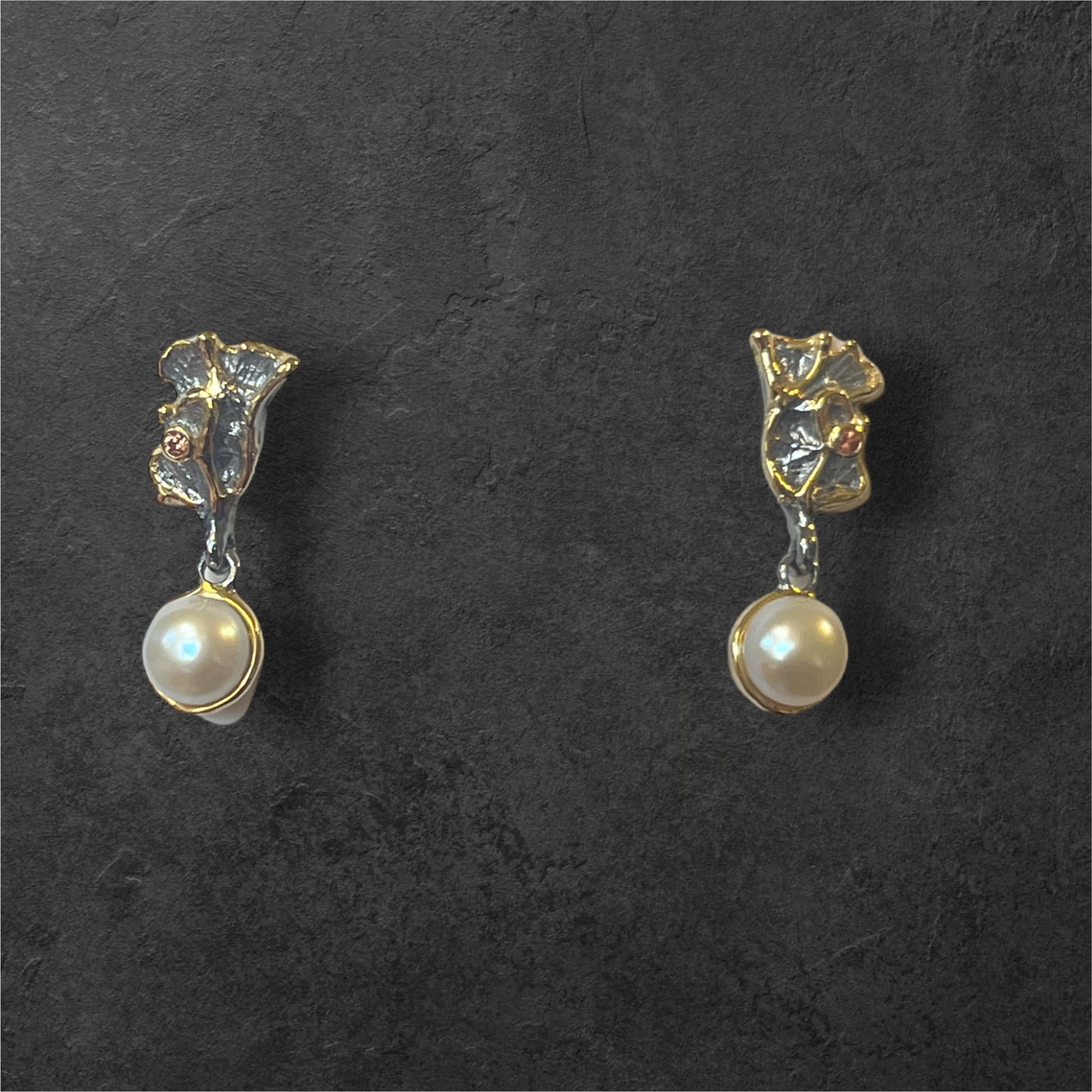 Designer Sterling Silver Earrings. One of a kind. Freshwater pears with rhodium and rose gold plating. 7 mm
