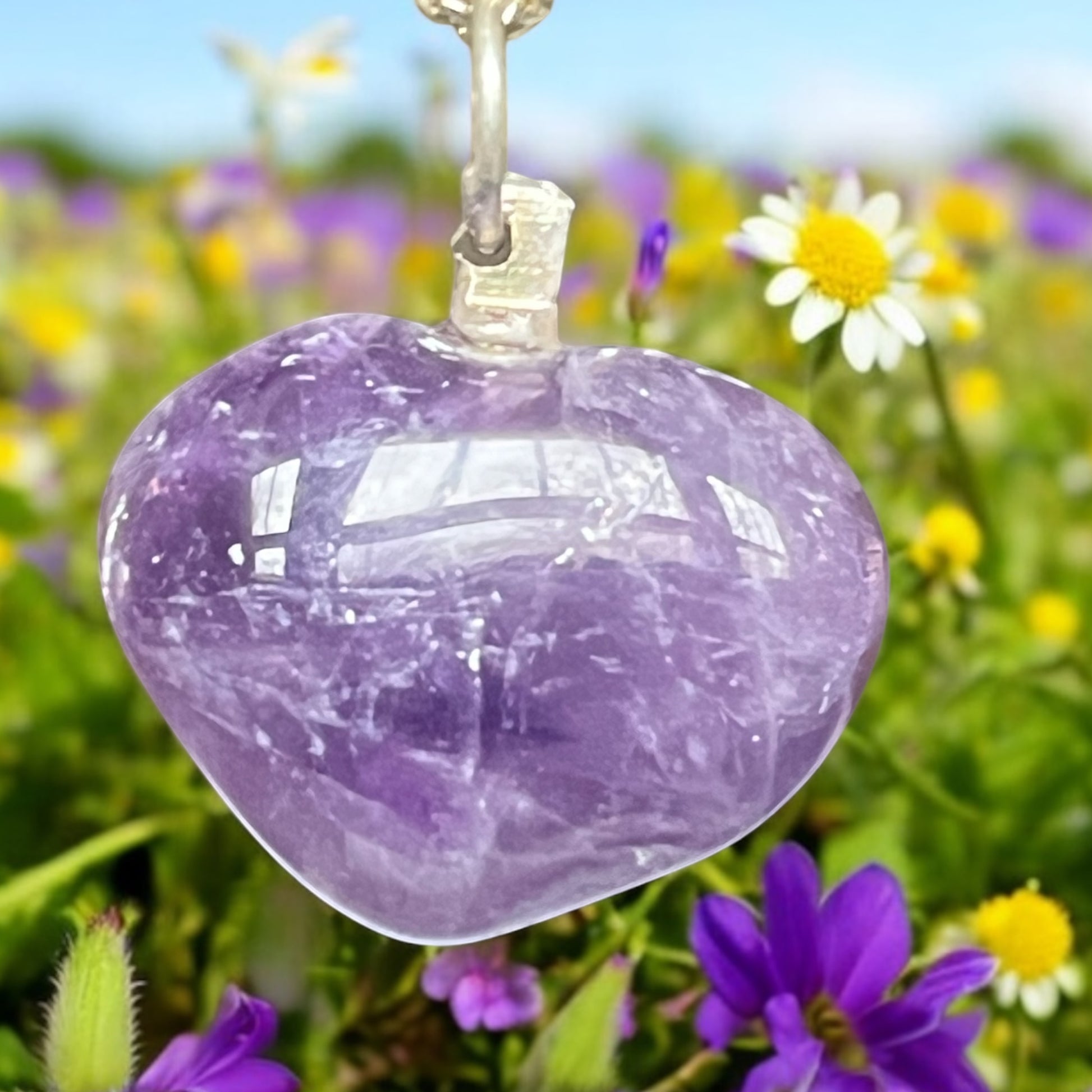 Transparent clear quartz, purple amethyst, or rose quartz heart pendant on a silver adjustable length chain.