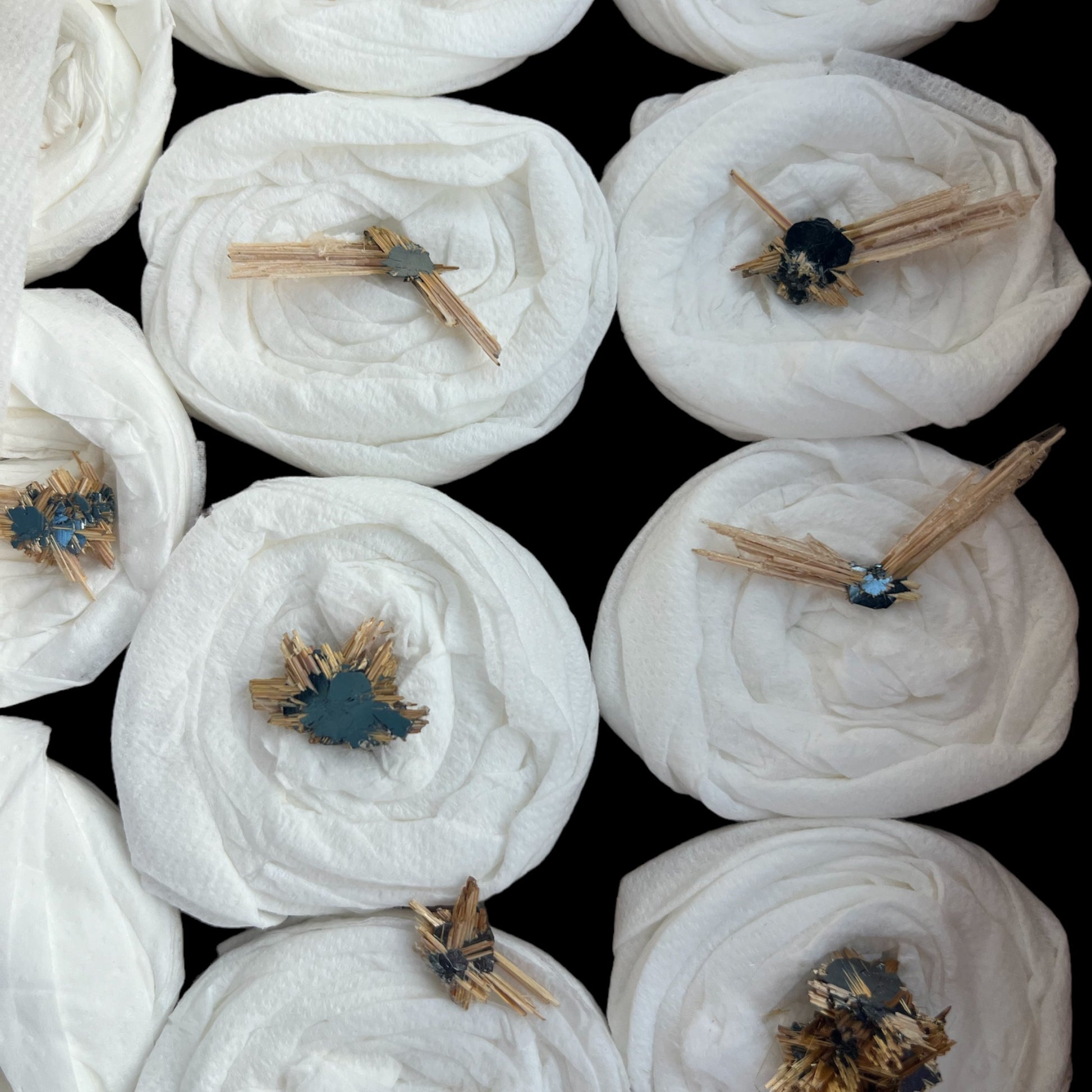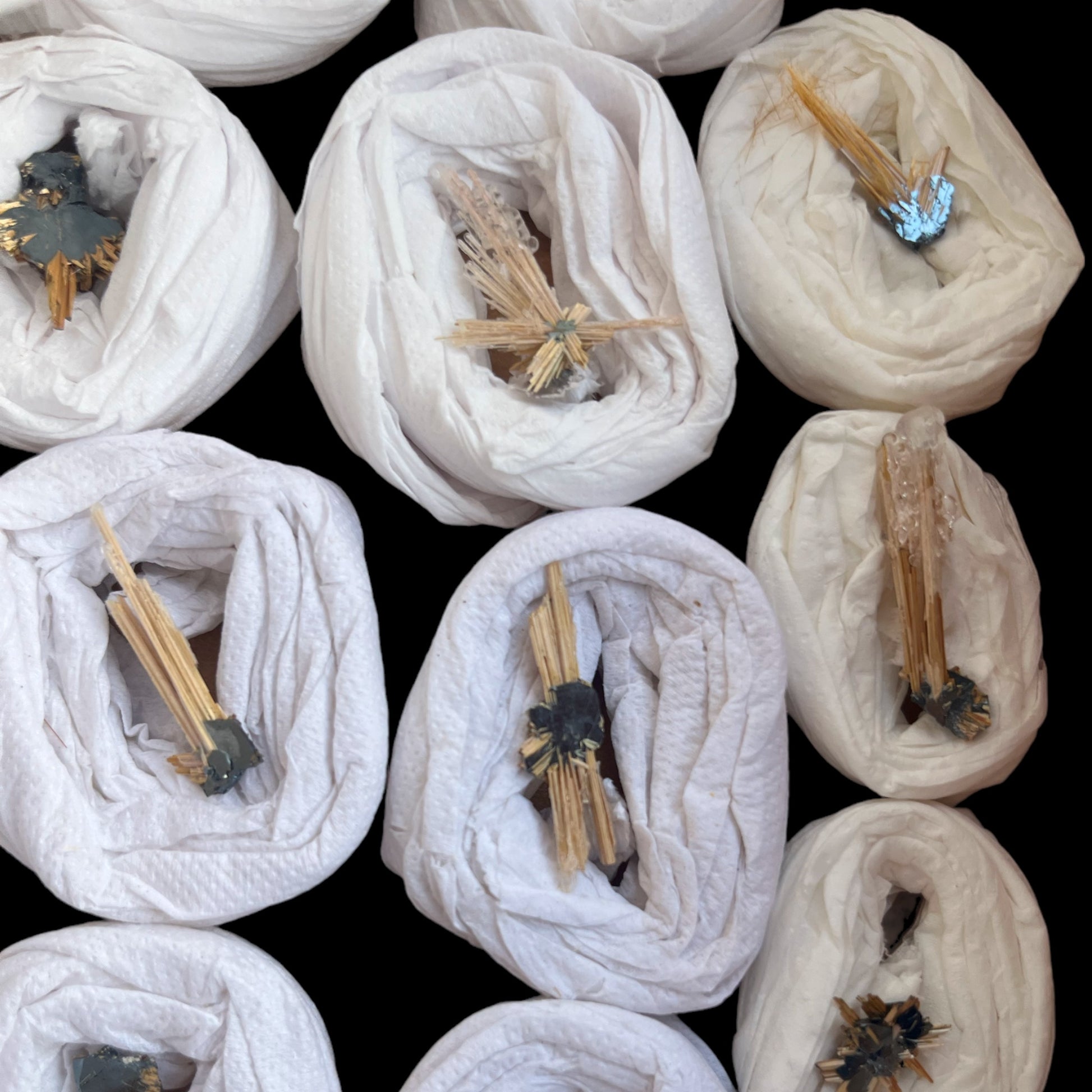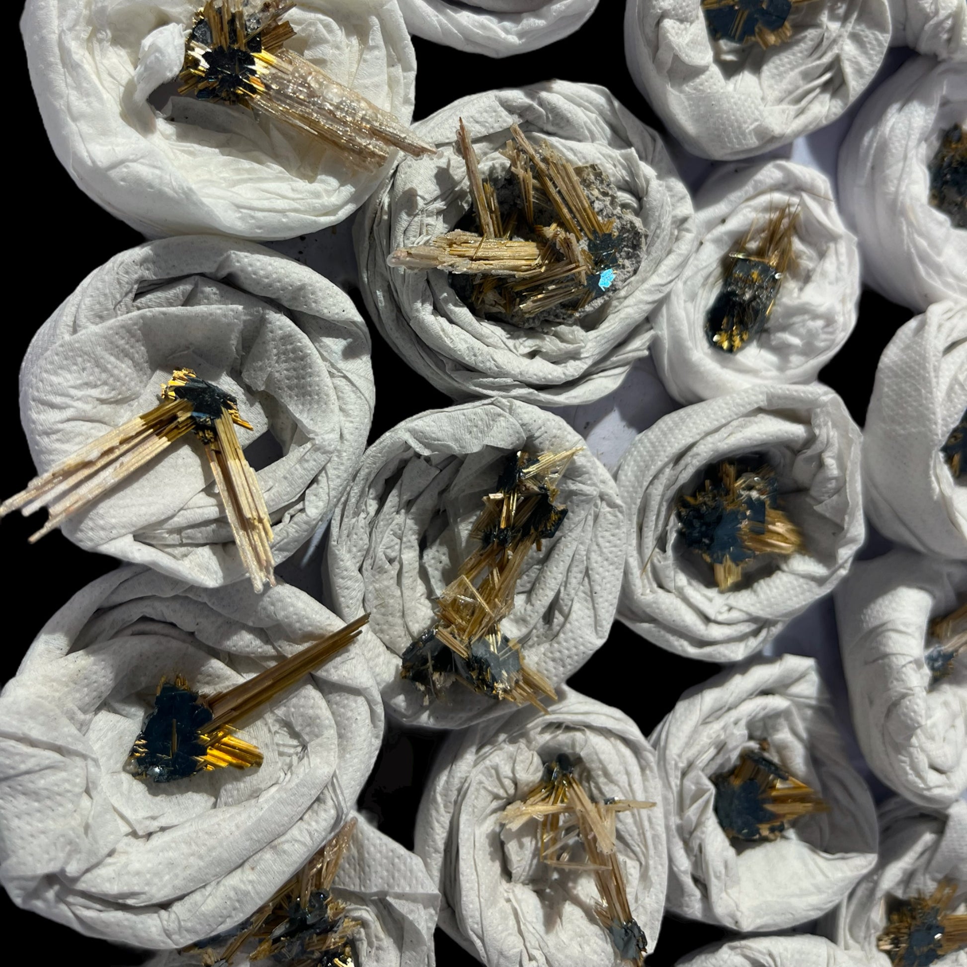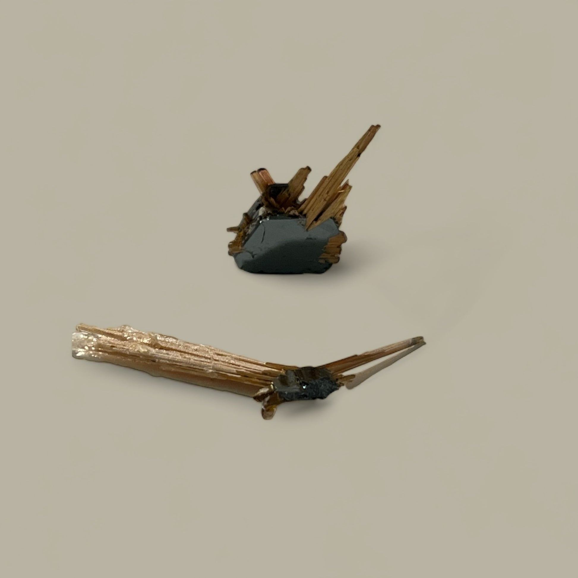 Rutile, which look like golden needles, are attached to the gray metallic hematite in a beautiful, mesmerizing formation. These specimens are known to lift ones mood and combat depression and provide a shield of protection.
