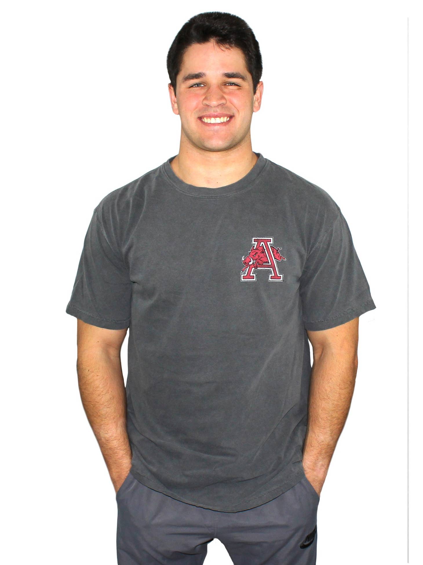 Printed in Fayetteville, Arkansas – home of the University of Arkansas Razorbacks. Perfect for game day or any Razorback fan wanting to represent their team. This item is printed on a Comfort Colors tee and features unisex sizing.