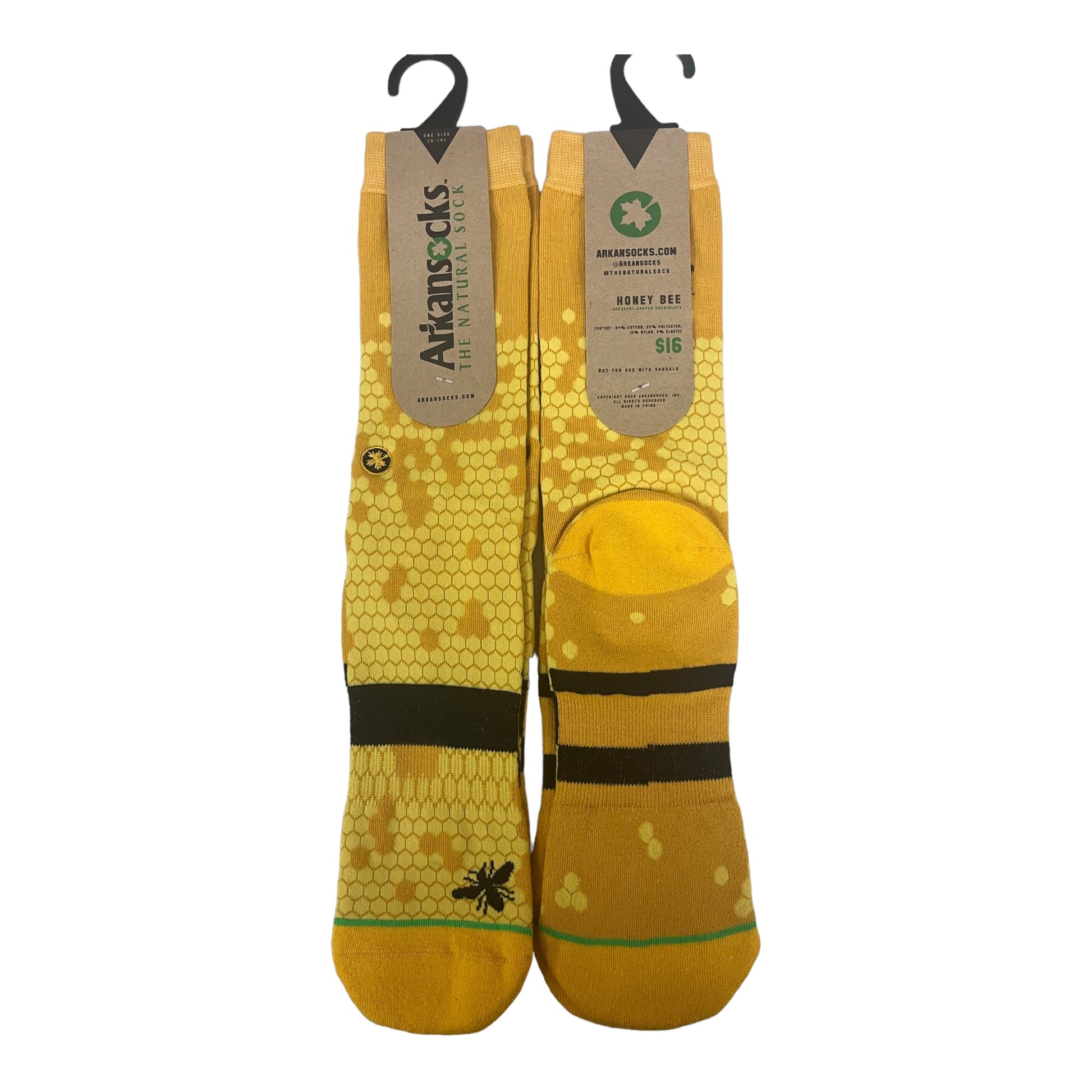 Whoa! The Honey Bee is also the Arkansas State Insect. The design inspiration for this sock is a no-brainer, but the details are more complex than you'd think. The Honey Bee features a mix of cotton/polyester/nylon construction that gives the sock raised and lowered textures, a super soft feel, and elasticity where it matters most. PRODUCT DETAILS 54% Cotton, 25% Polyester, 15% Nylon, 6% Elastic Dress Fit Canyon Gold/Black