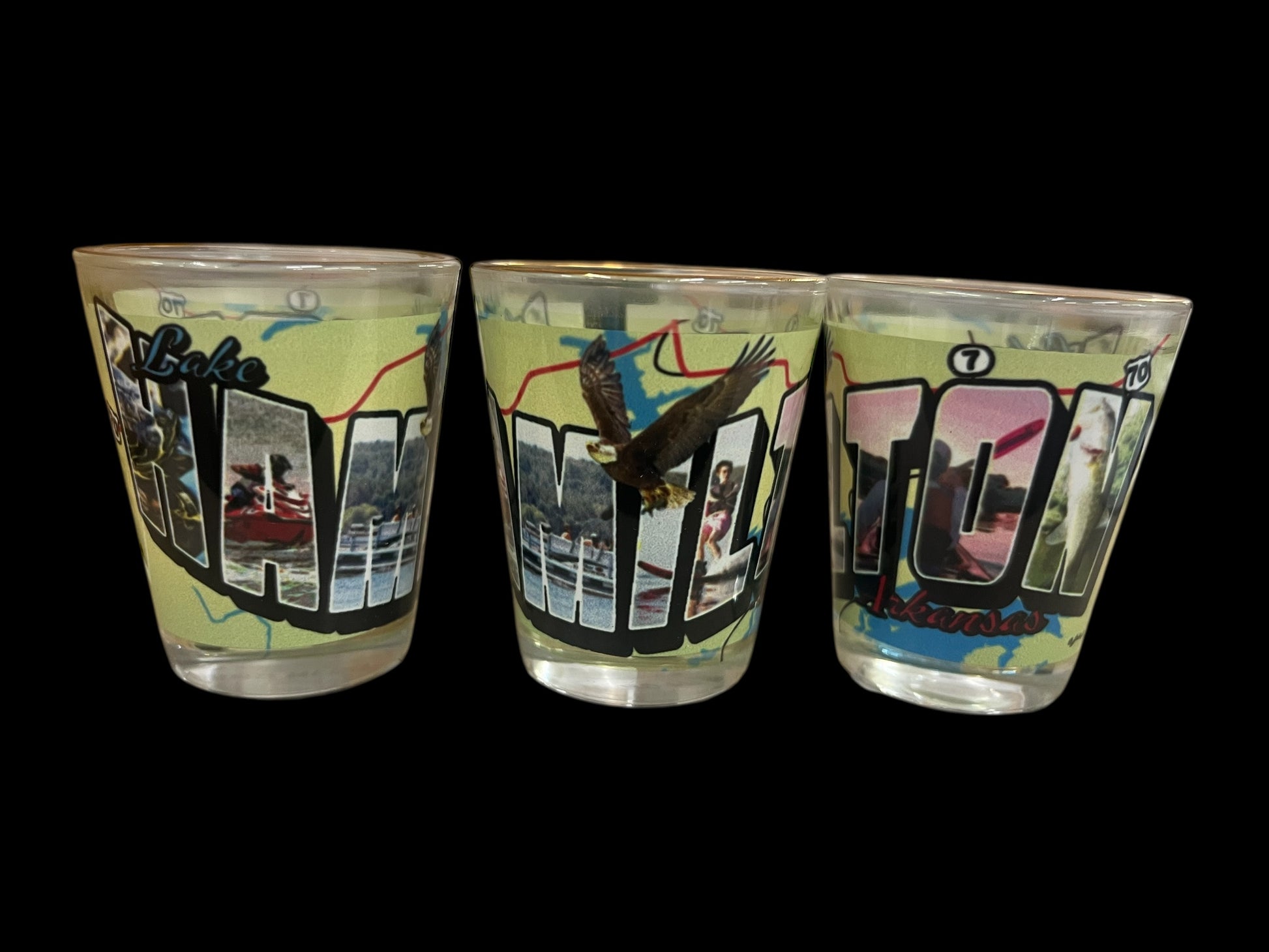 Gold rimmed shot glass that spells out and shows scenes from the Best-known lake in Hot Springs, Arkansas.