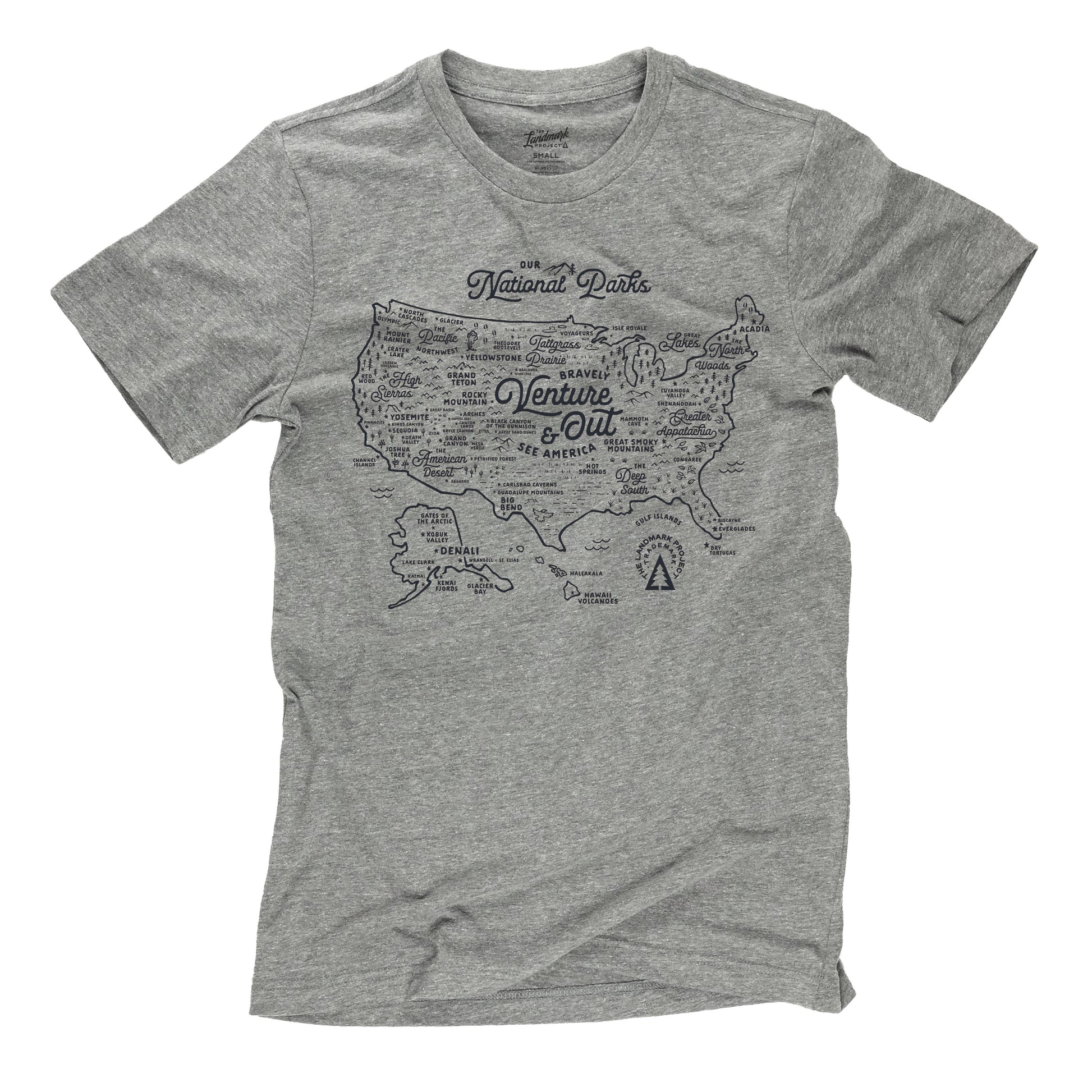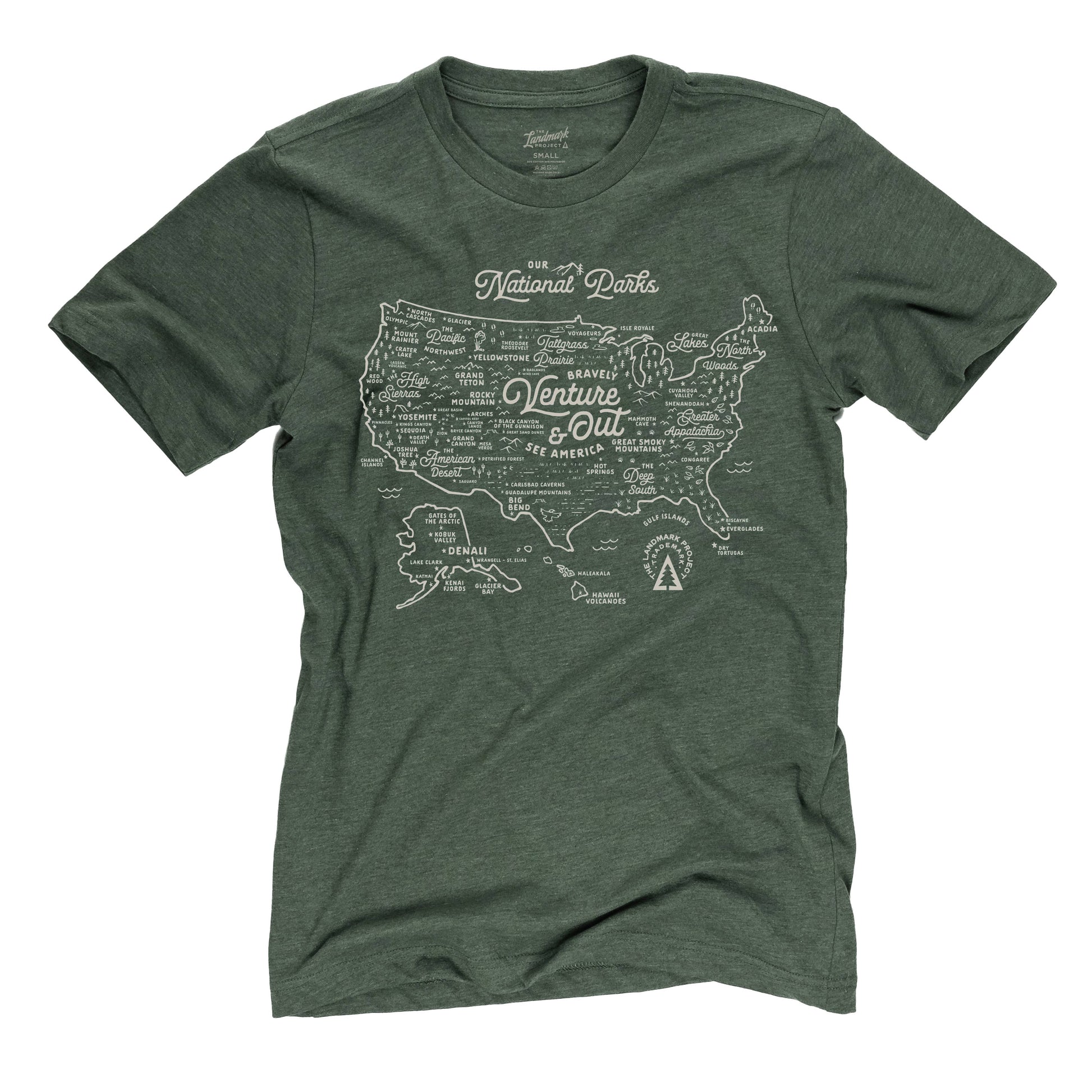 U.S. map of the National Park system, including Hot Springs National Park. Landmark tees come in standard unisex sizing, are pre-washed and pre-shrunk, and are sustainably made from a super soft blend of 60% BCI Cotton and 40% Recycled Polyester.