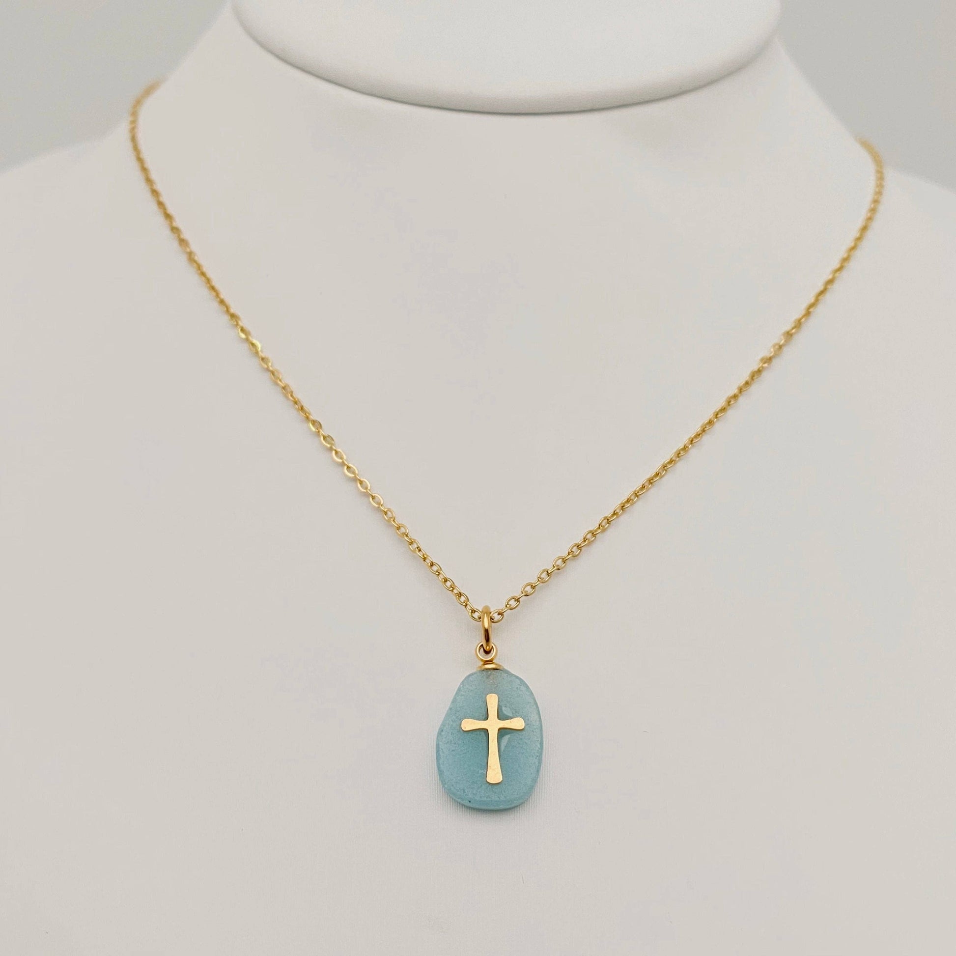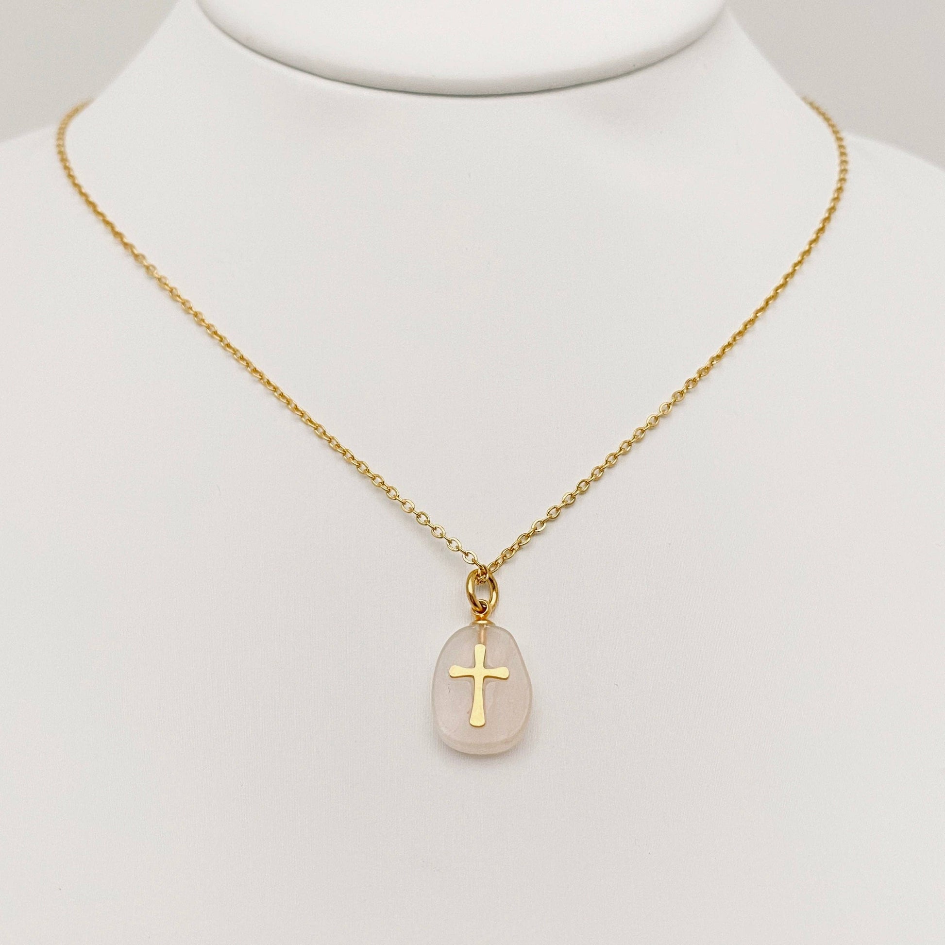 Natural Stone Stainless Steel Cross Pendant Necklace - CS