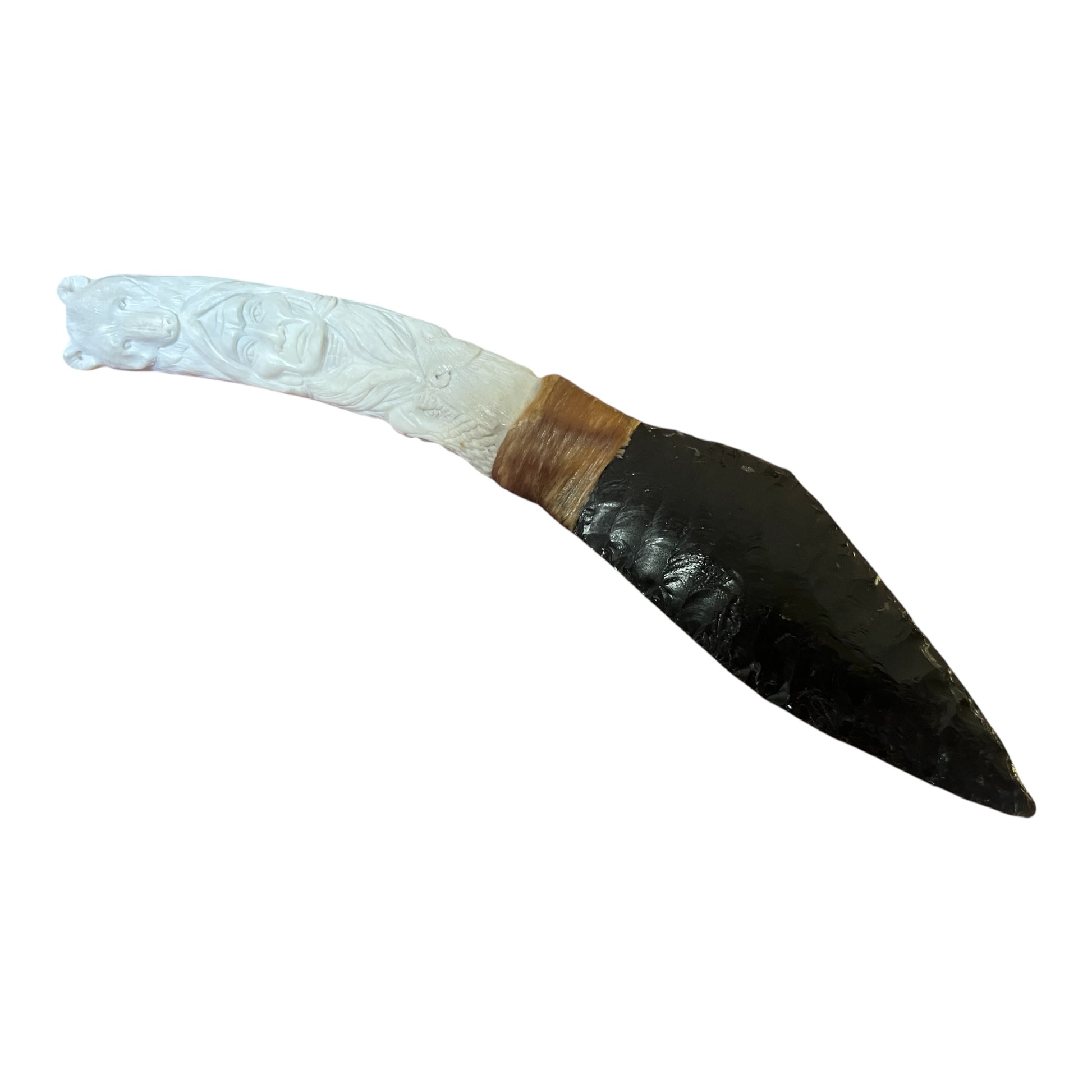 Hand-knapped obsidian arrowhead blade and hand-carved antler featuring various wildlife.