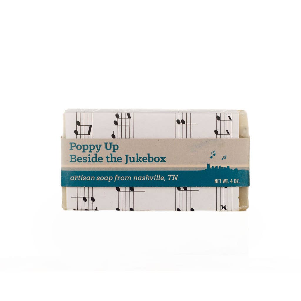 “Poppy Up Beside the Jukebox” will have you hollering, "Lord I wanna go to heaven, but I don't wanna go tonight"! Poppyseeds are added to each bar for exfoliation, and a blend of patchouli and lavender essential oils are the perfect duo for that song before your boots are filled up with sand. Each bar is wrapped in a piece of sheet music.
