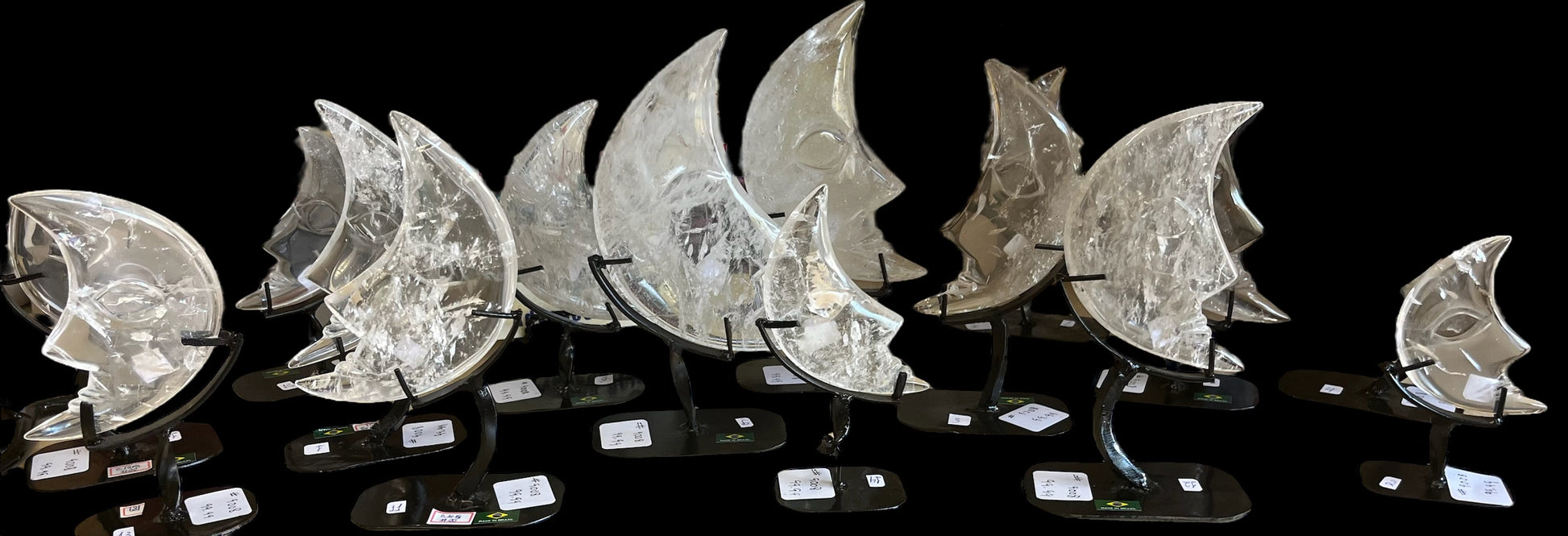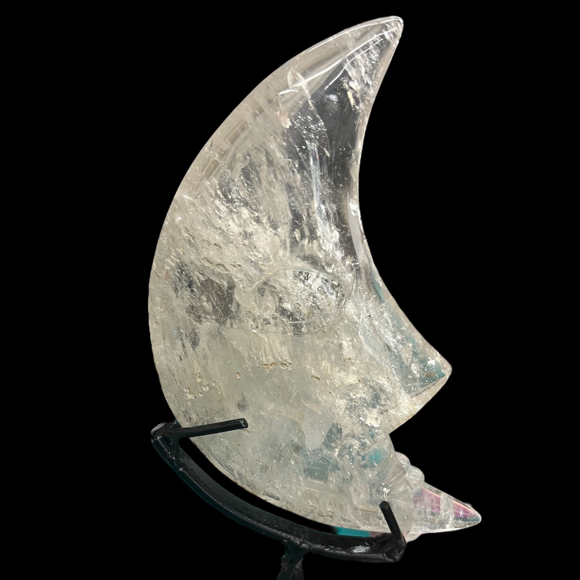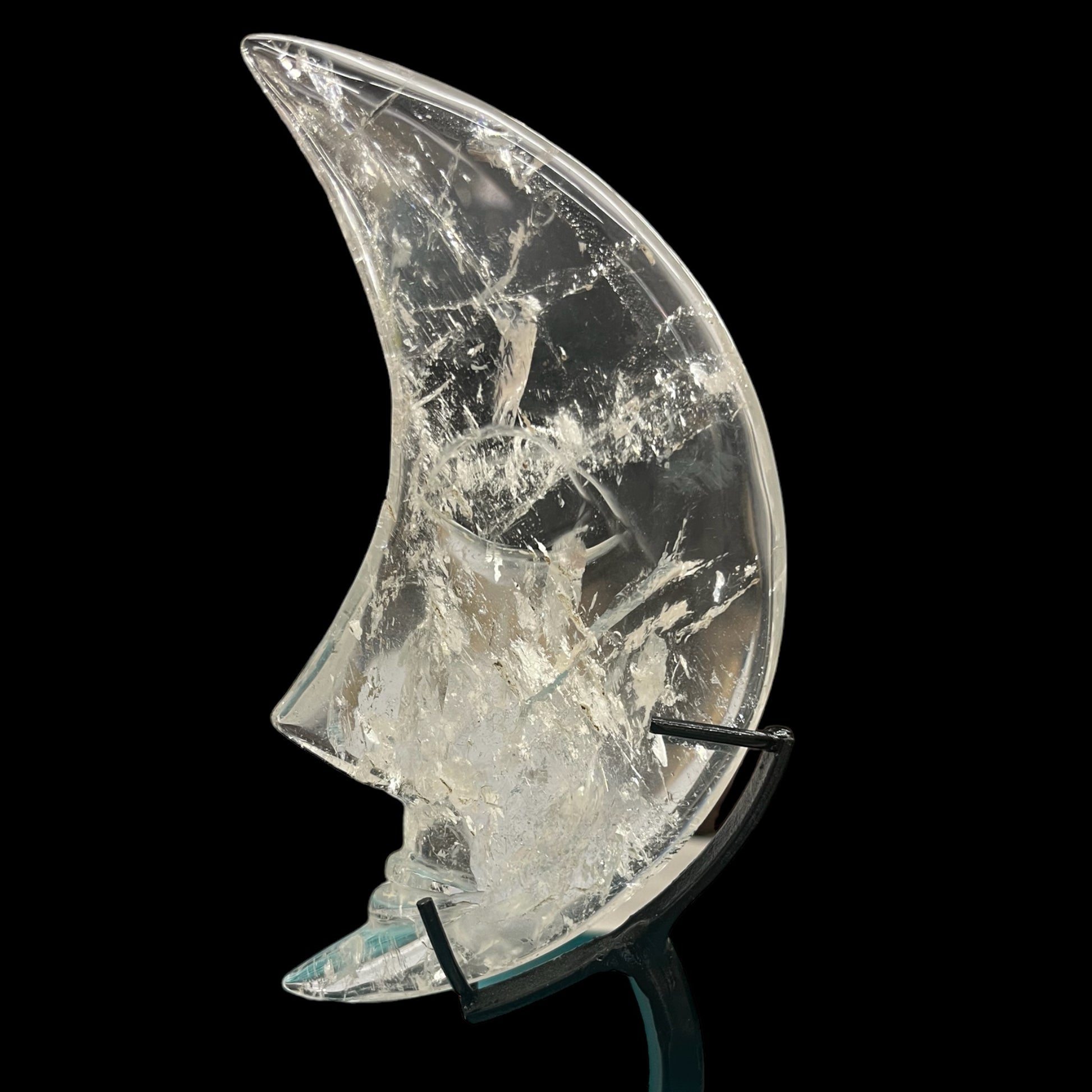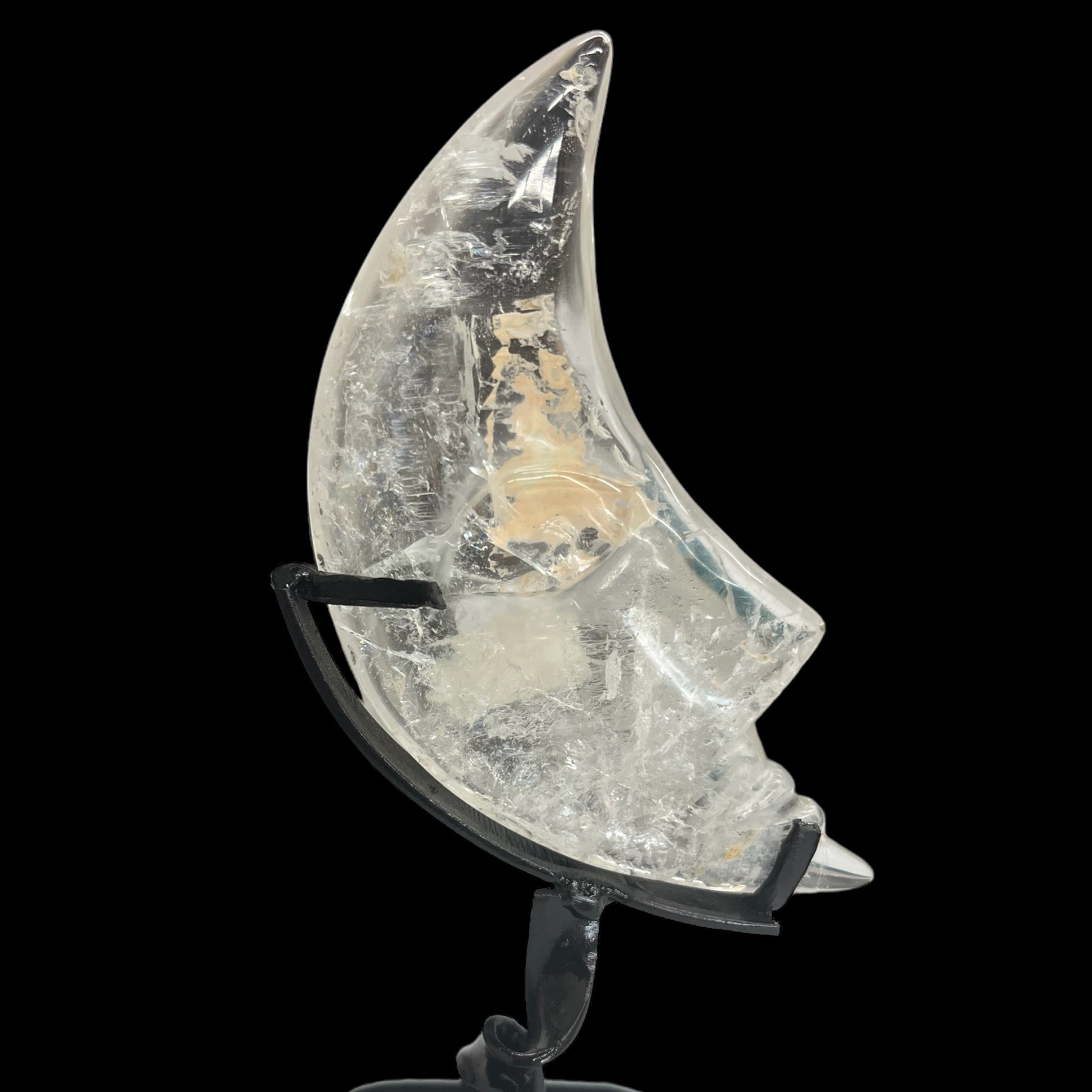 Quartz crystal, known as a master healer, has been carved into a crescent moon. Moons are thought to help reveal our inner thoughts and emotions.
