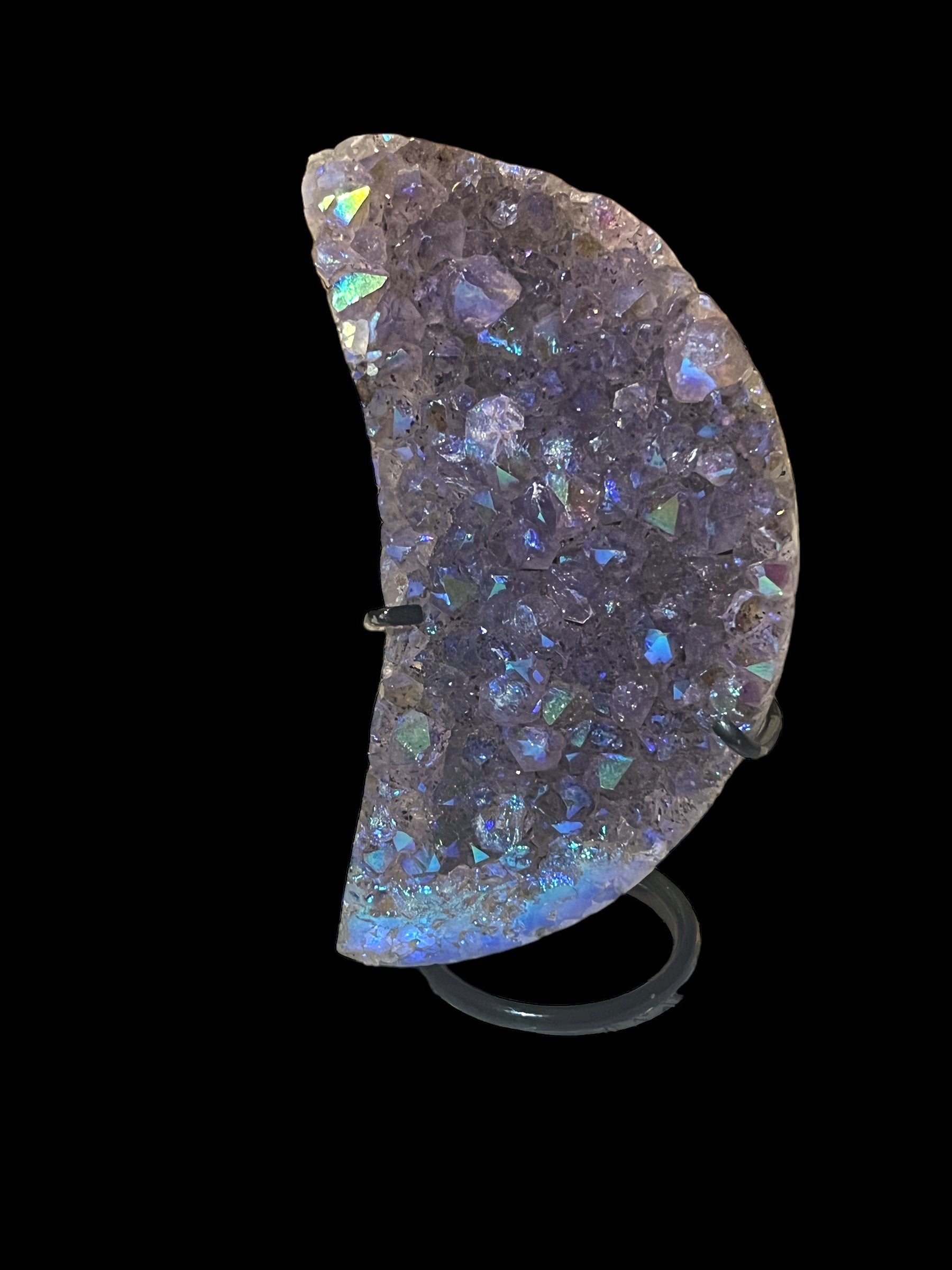 Celebrate each phase of your life with this crescent phase of the moon. Amethyst is thought to bring about peace in your life, and the titanium aura help bring a little sparkle in the occasional darkness of night.